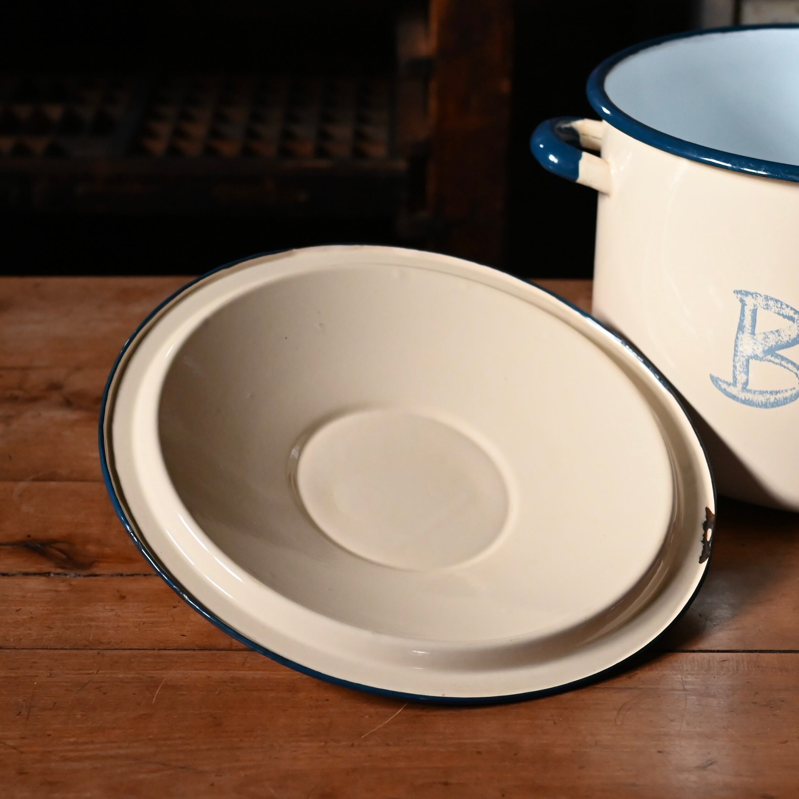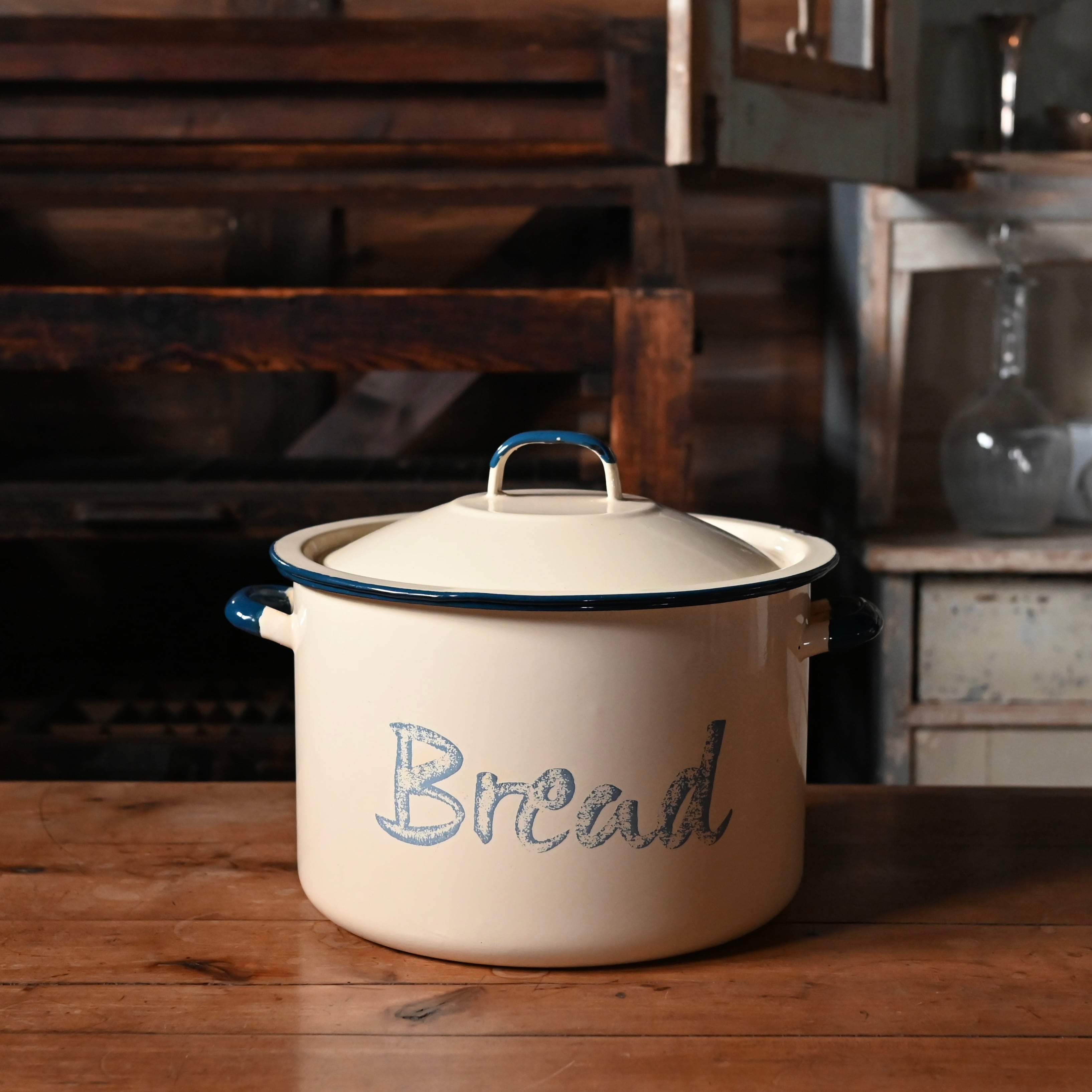 優しいクリーム色の琺瑯の両面に"Bread"の文字が入っていて、蓋や持ち手のブルーのラインがアクセントになっています。