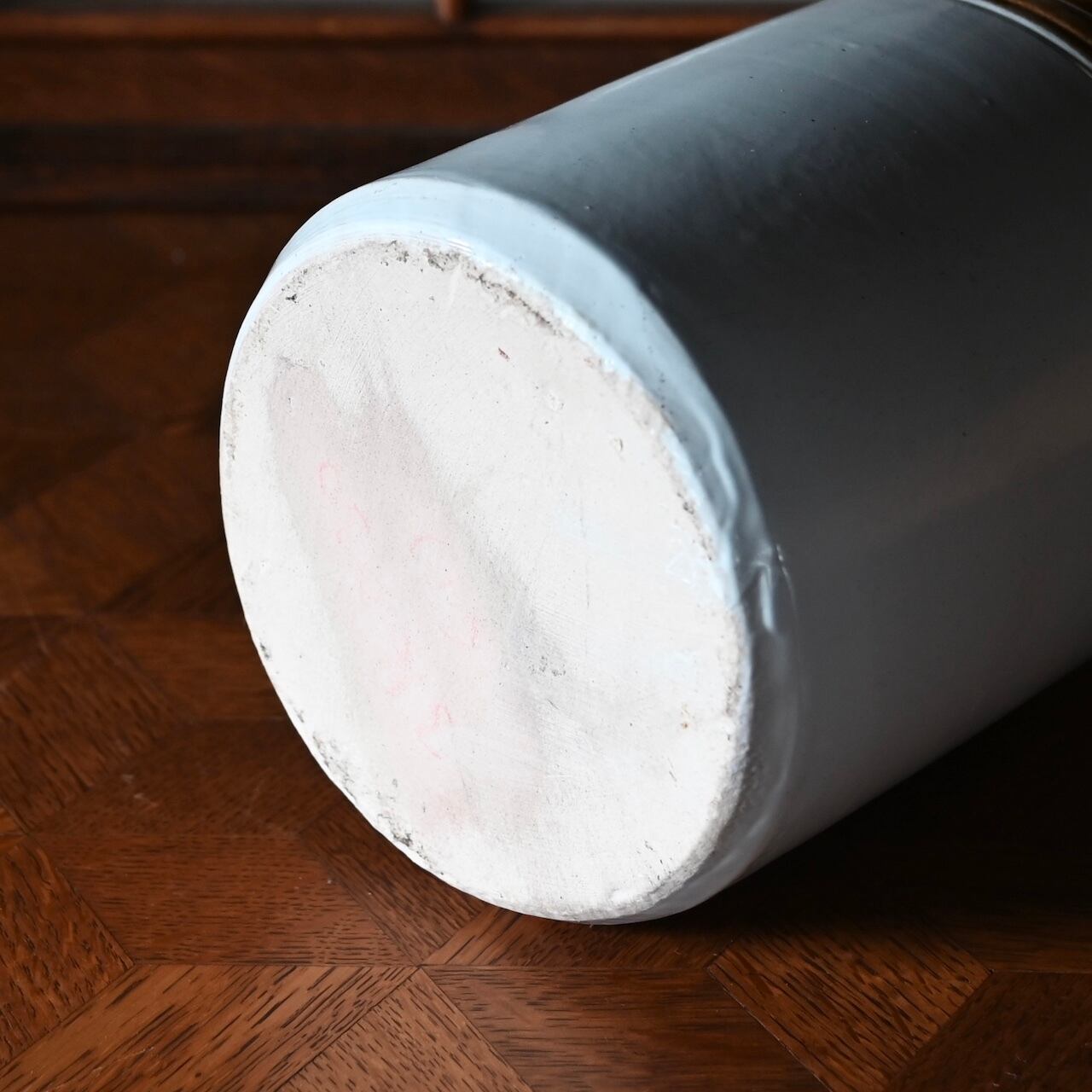 ツートンカラーの蓋付きの陶器のキャニスターで、当時はピクルスを漬ける保存容器として使われていました。