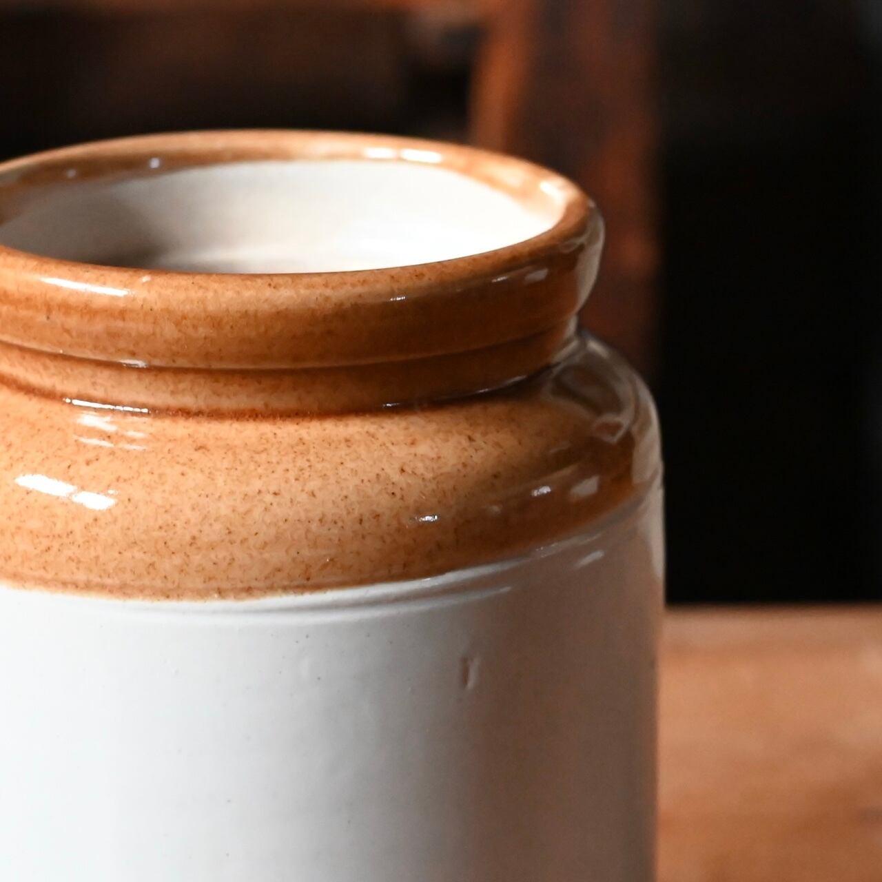 ツートンカラーの蓋付きの陶器のキャニスターで、当時はピクルスを漬ける保存容器として使われていました。