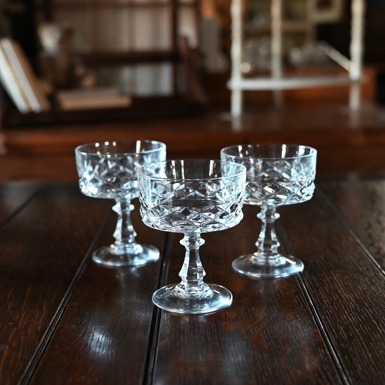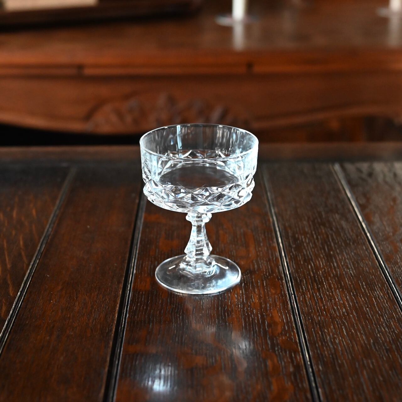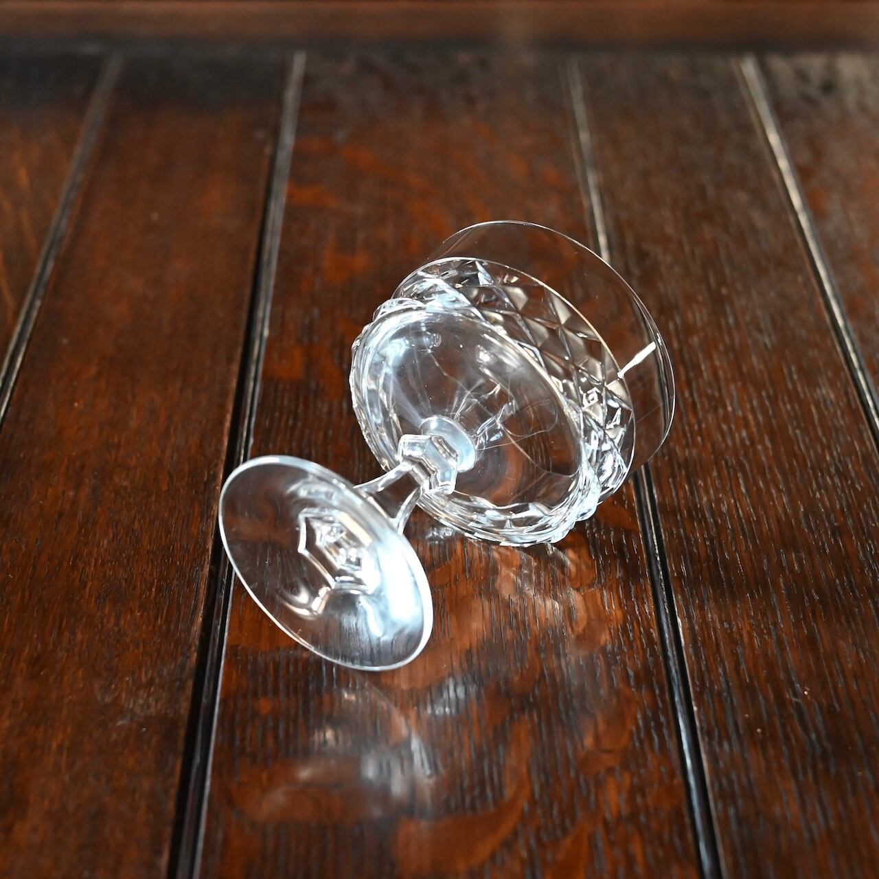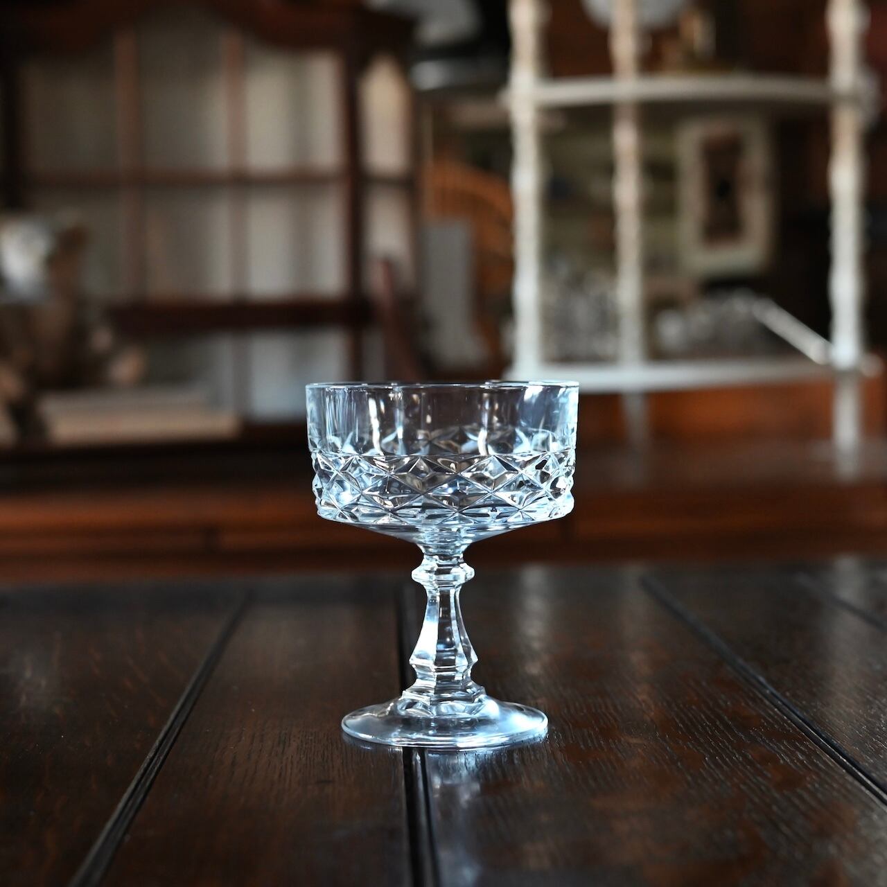 フランスの"Cristal D'arques(クリスタル ダルク)社"のもので、広い口にクラシックなダイヤモンドカットが素敵で、シャンパンクープとしてやデザートグラスに使われていたものと思われます。