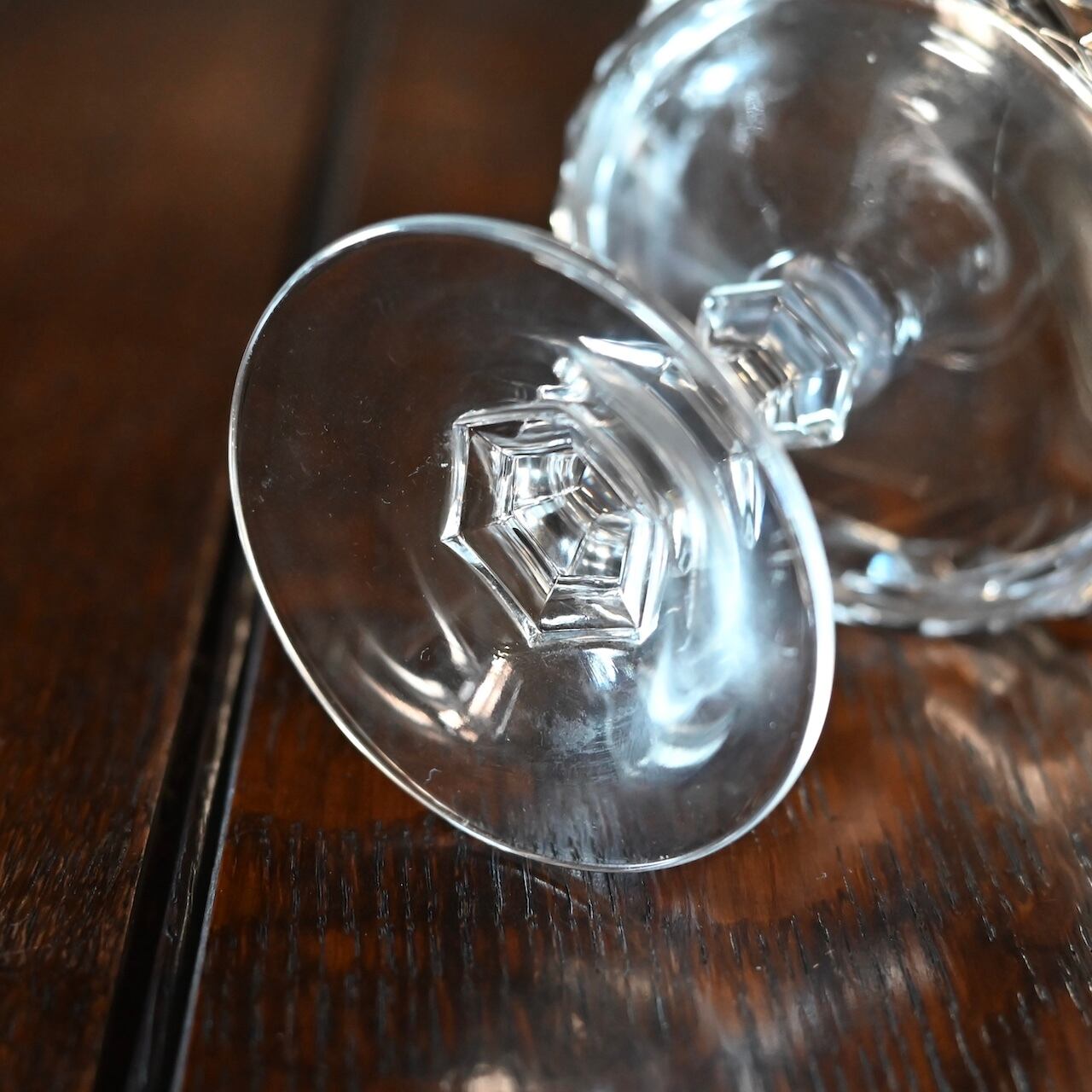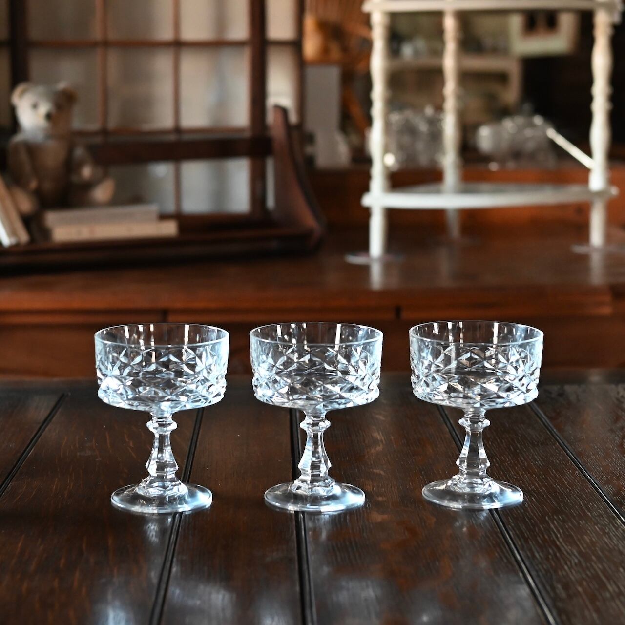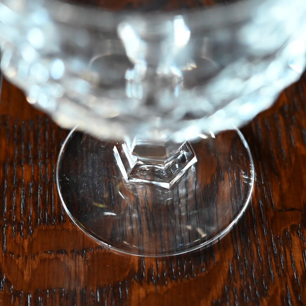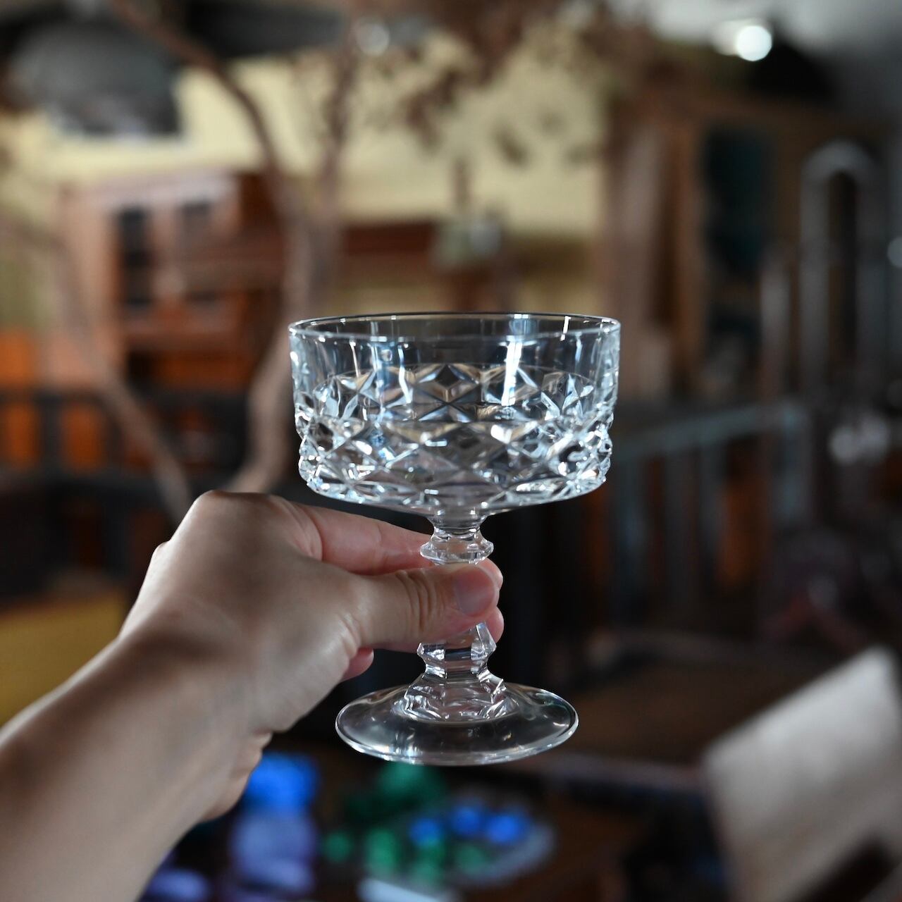 フランスの"Cristal D'arques(クリスタル ダルク)社"のもので、広い口にクラシックなダイヤモンドカットが素敵で、シャンパンクープとしてやデザートグラスに使われていたものと思われます。
