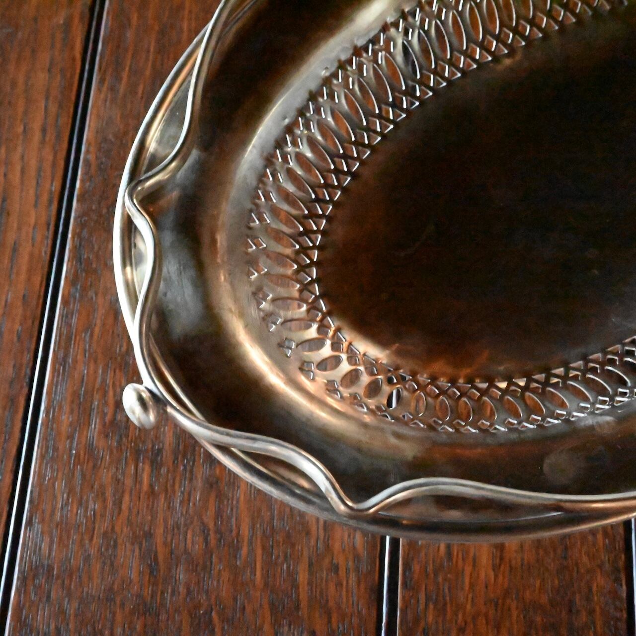 脚付きでオーバル型の深さのあるプレートに透かし彫りが施されたエレガントな雰囲気のバスケットです。