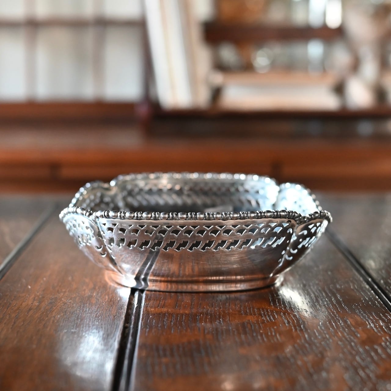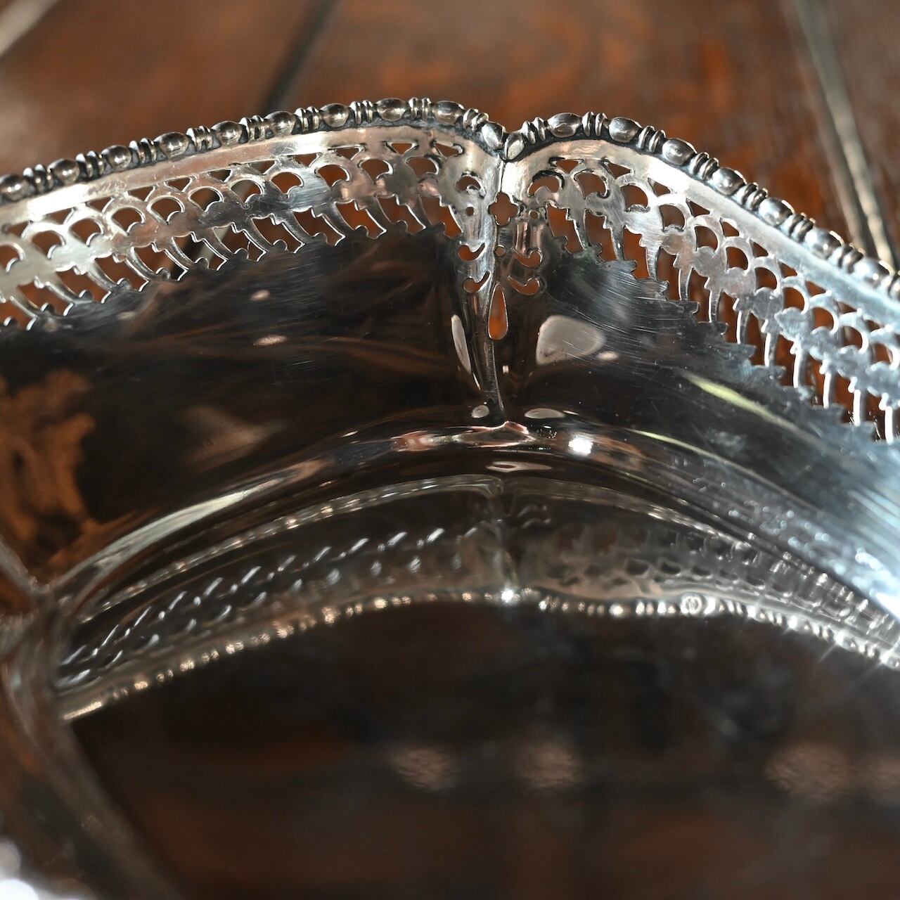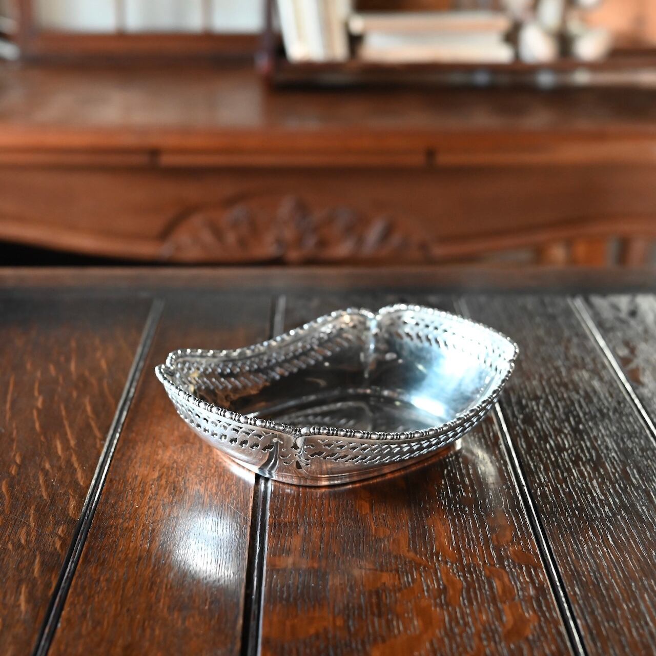 透かし彫りが施されていてエレガントな雰囲気で、少し深さがあるので果物を入れたりするのにちょうどいいバスケットです。