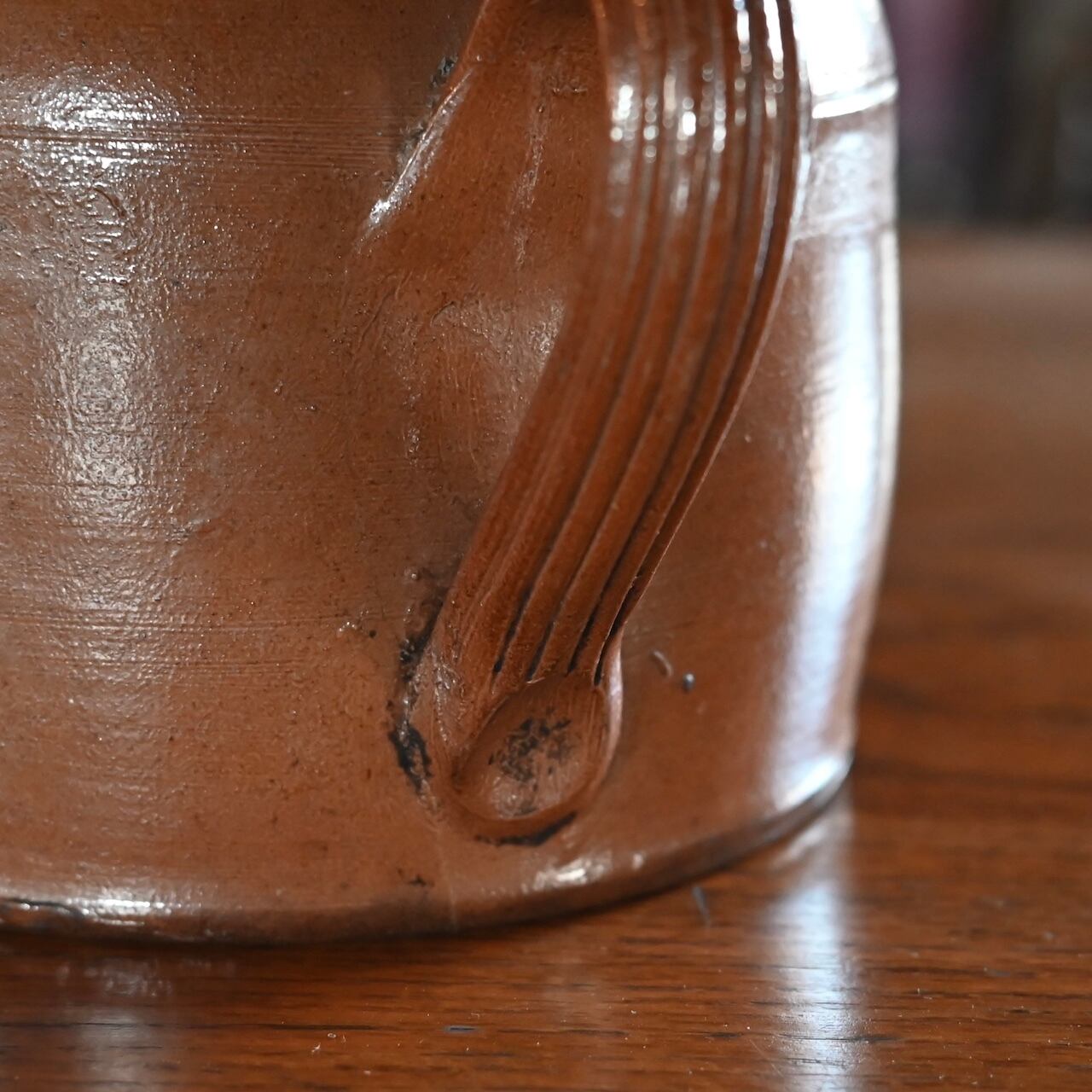 元々はコルクの蓋をして保存食を入れておく為に使われていて、持ち手が付いたぽってりとしたデザインが可愛らしいコンフィポットです。