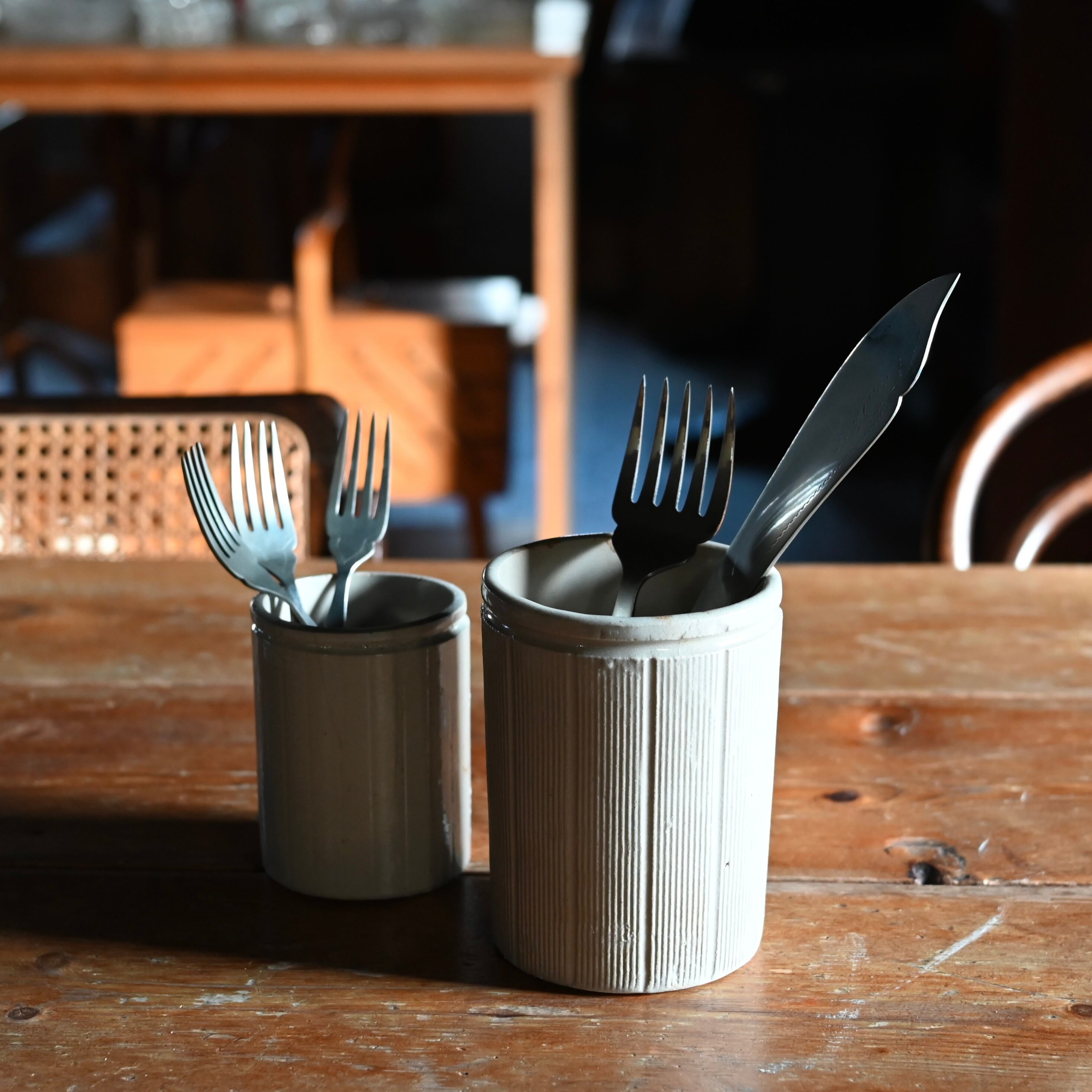 全体的に傷や欠け貫入が多く、アンティークの風合いが魅力的で、カトラリーの収納やペン立てとして使用するのがおすすめです。