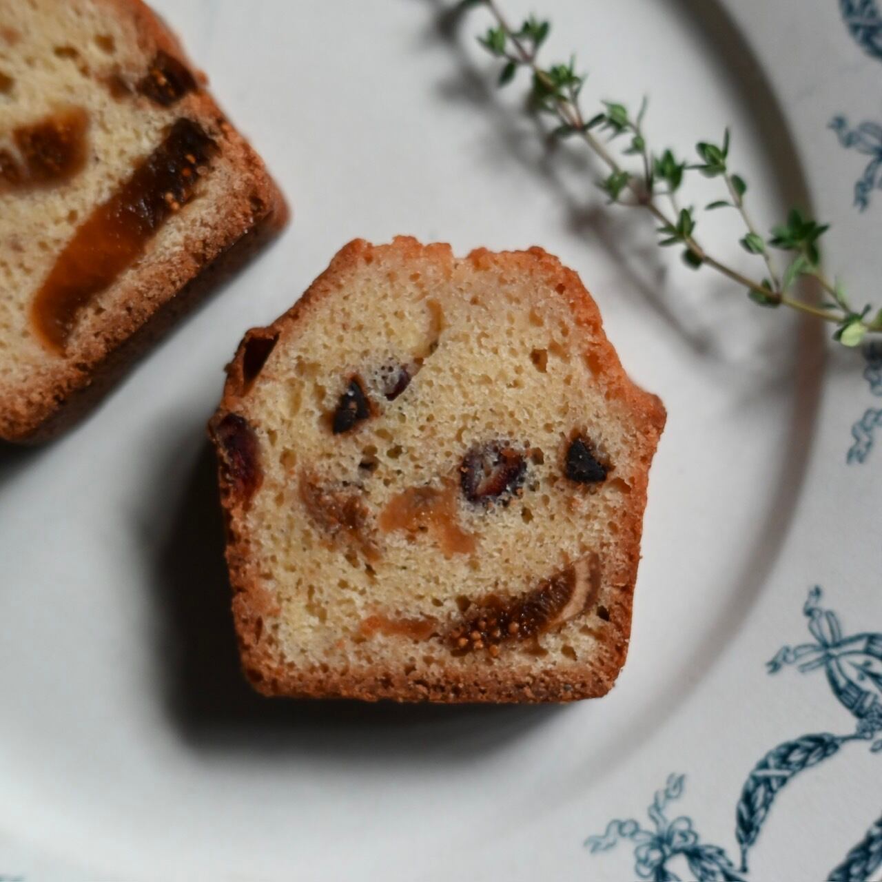 バター、小麦粉、きび砂糖、卵、ドライいちじく、クランベリー、ブランデー、アーモンドプードル、チョコチップ、ベーキングパウダー(アルミフリー)、カルダモン