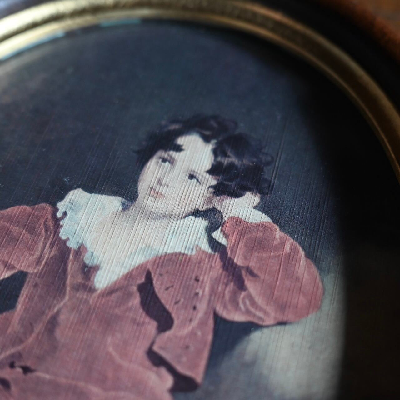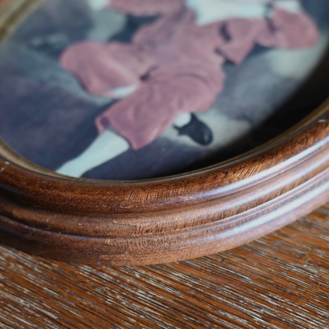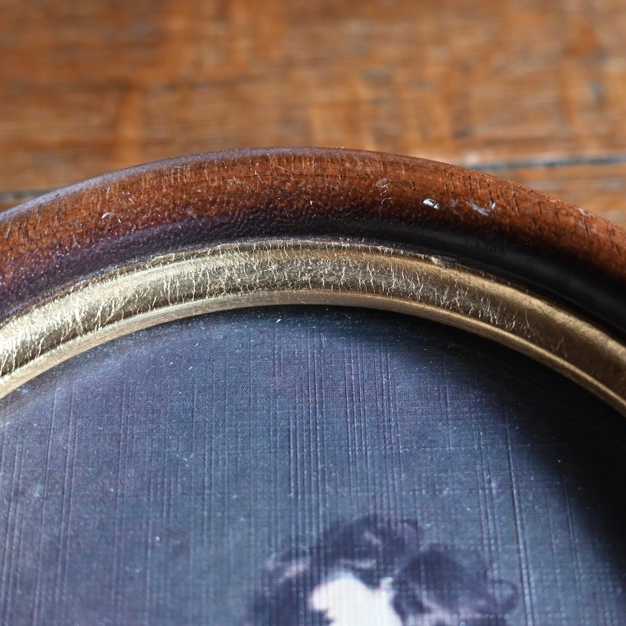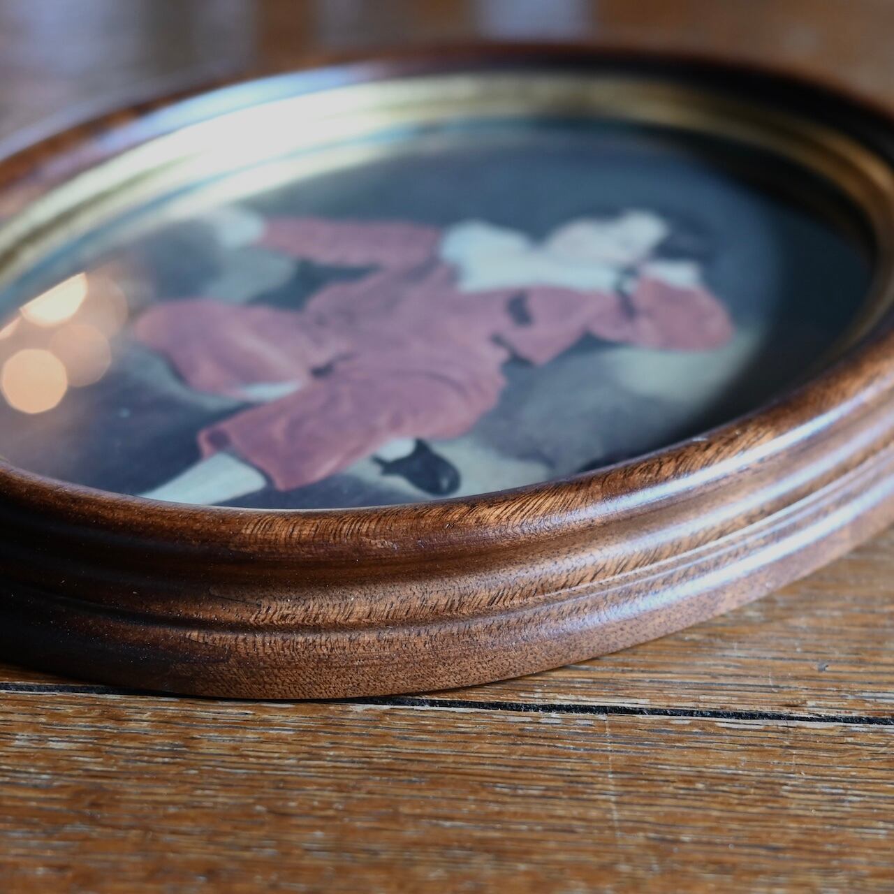 楕円形のフレームと落ち着いたブラウンとゴールドがカッコよく、ガラスが嵌められていて高級感があります。