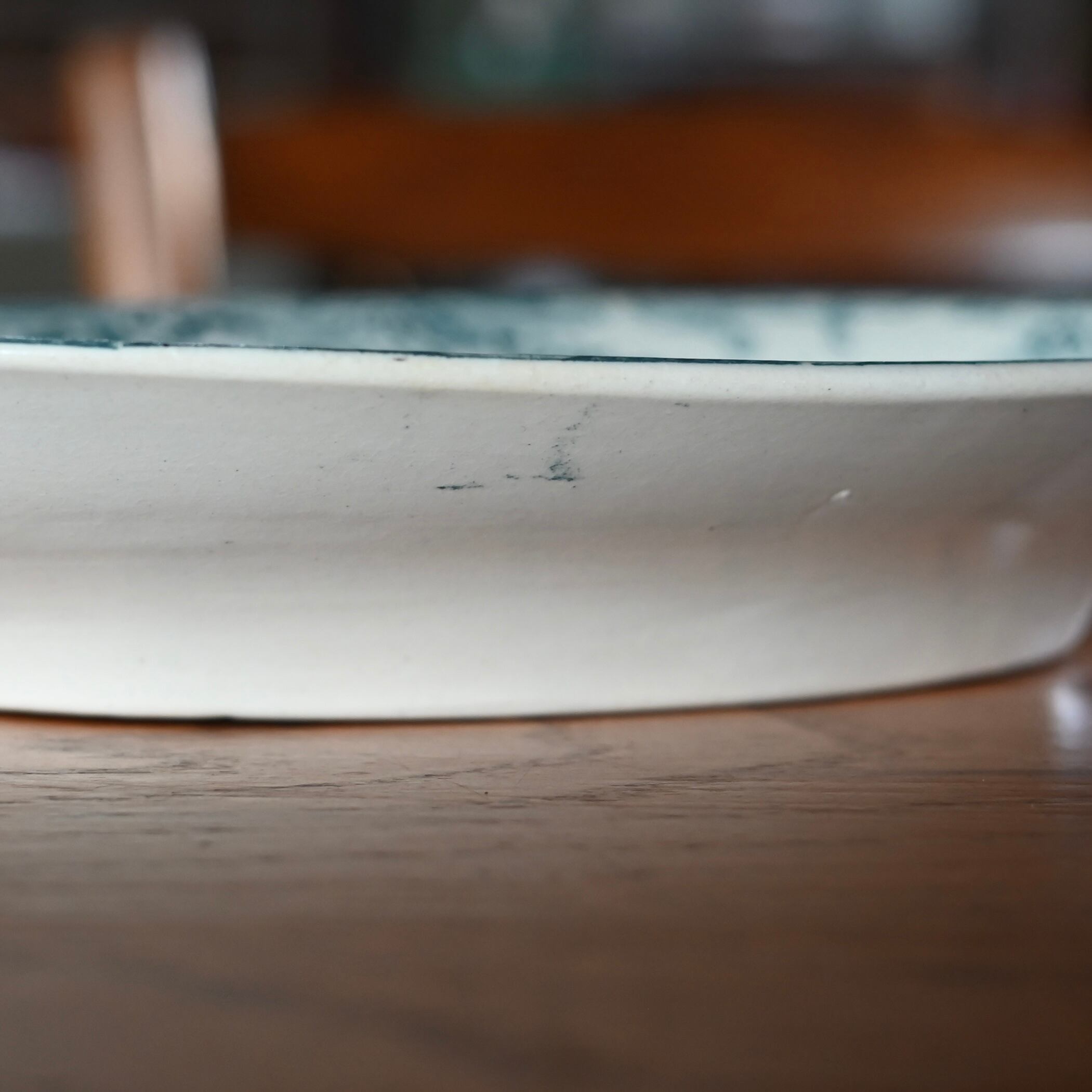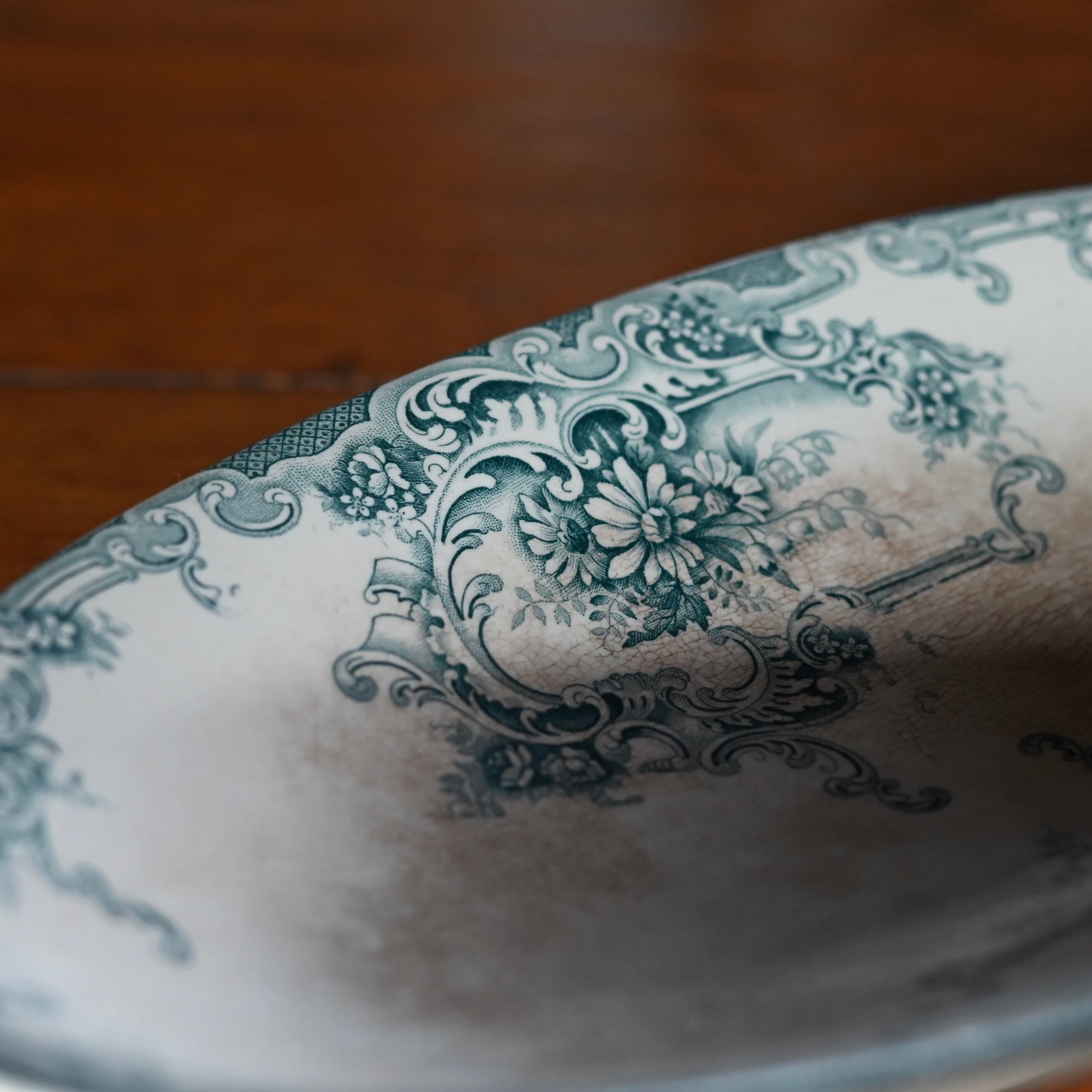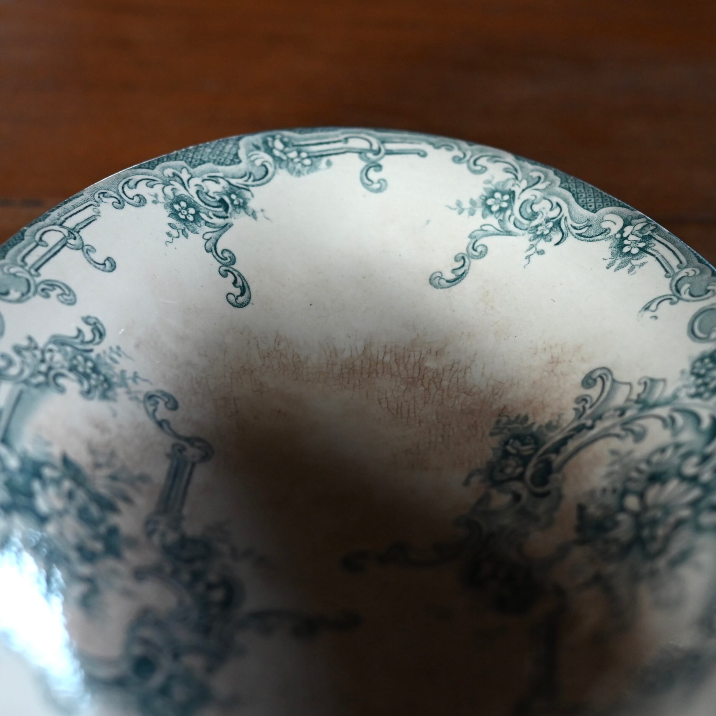 当店で取り扱いをしている食器は80年以上経過しているものが殆どです。古いものになりますので、貫入(釉薬の細かいひび割れ)やカトラリーによる傷、シミや汚れ、小さな欠けなどがあるものもございます。なるべく細かく写真を撮っておりますが、撮りきれない部分や水を含んで現れる貫入などもありますので、神経質な方や新品のようなクオリティーを求めるお客様には不向きな商品になっております。