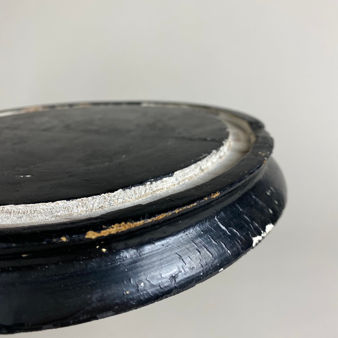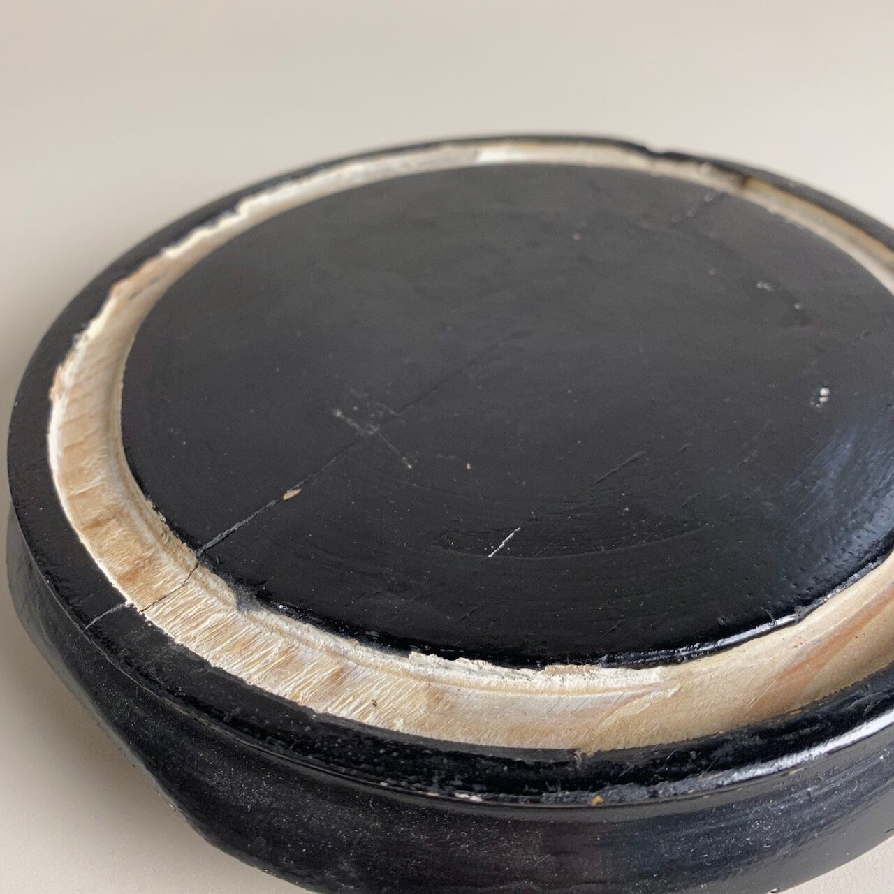 ゆらゆらしたガラスと所々にある気泡が年代を感じさせるアイテムです。黒くペイントされた台座には、小さな丸い脚が付いています。