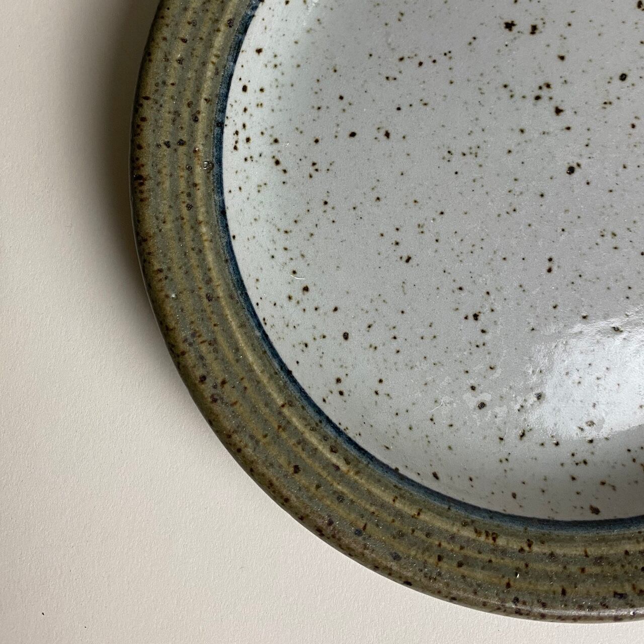 淡いカーキとグレーの、ツートンカラーのプレートです。直径約180mmで、お菓子やお料理の取り皿などにおすすめのサイズです。