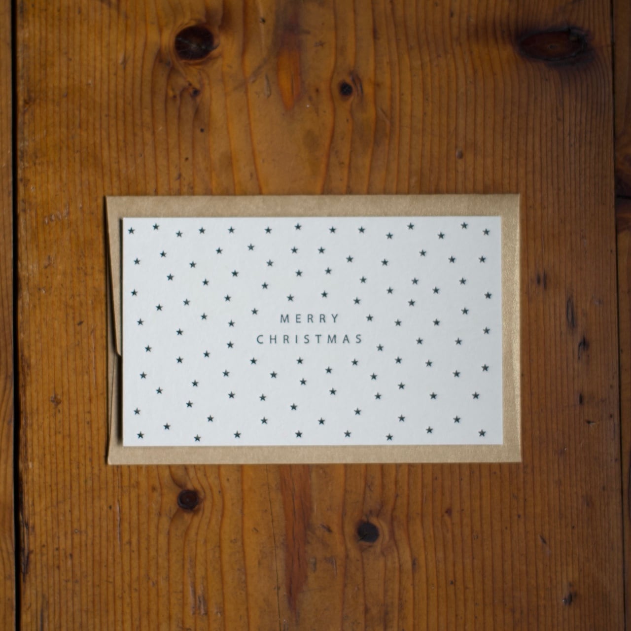 星が散りばめられたクリスマスのメッセージカードとゴールドの鮮やかな封筒がセットになっています。