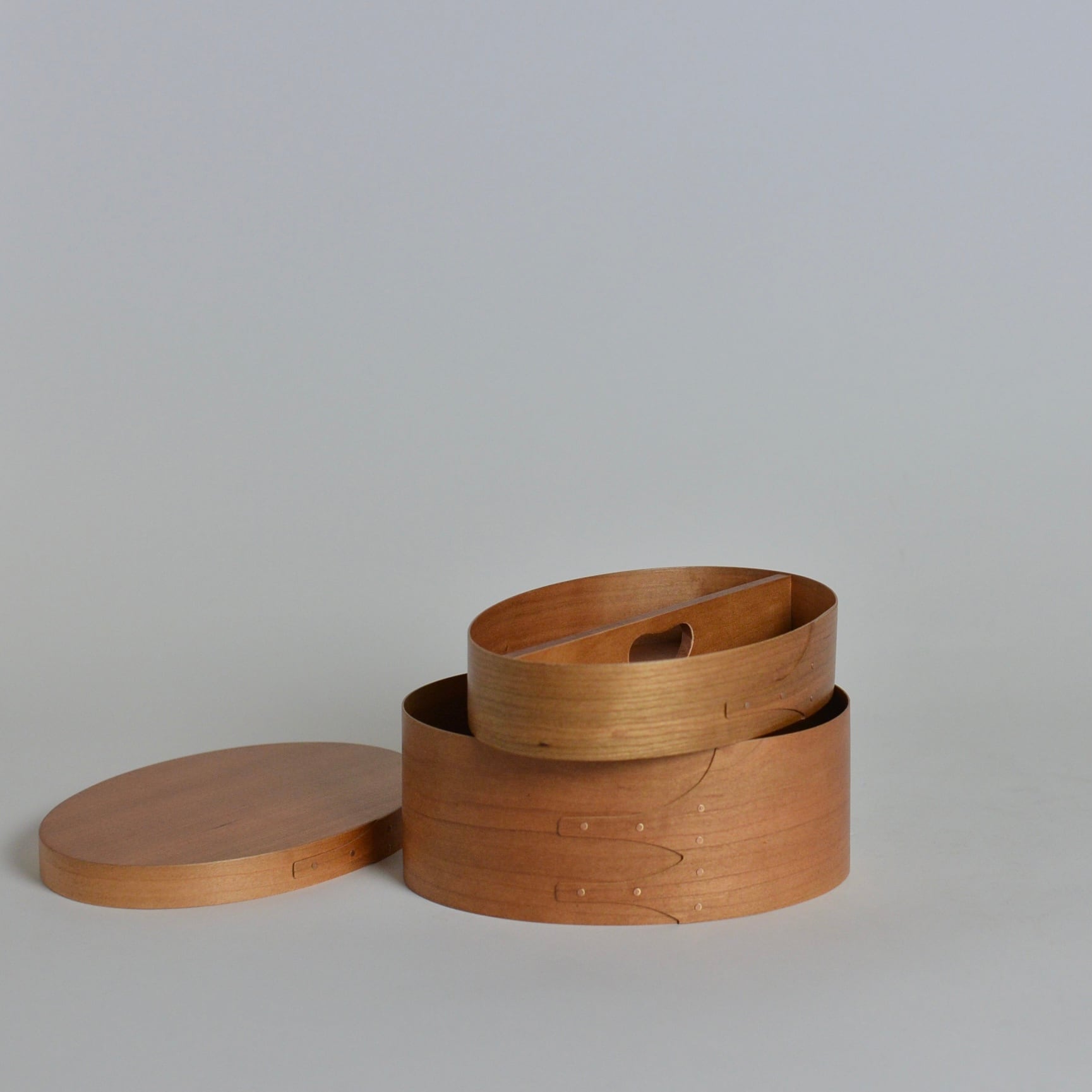 薄くスライスされた木材を曲げて作ったオーバル型のソーイングボックスです。