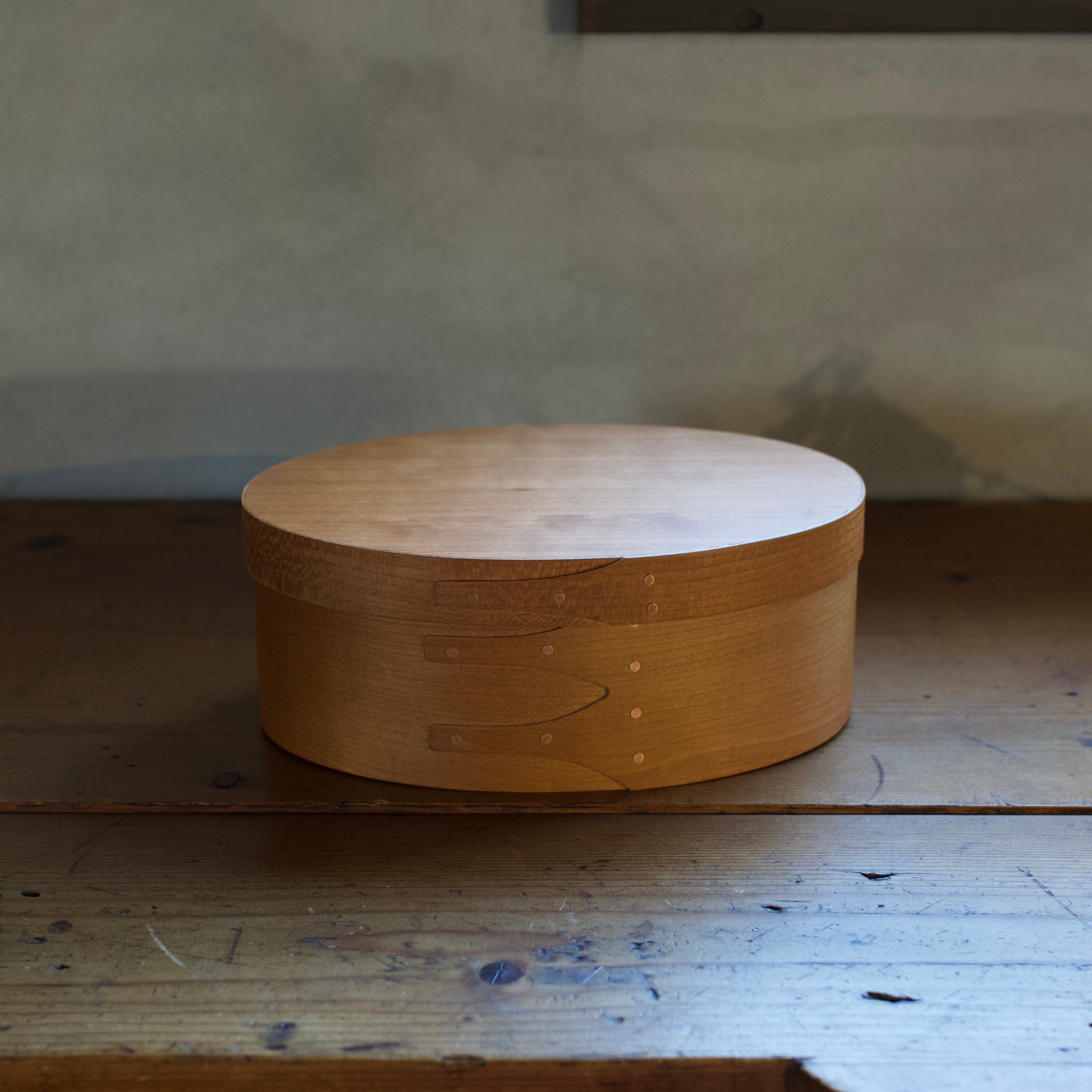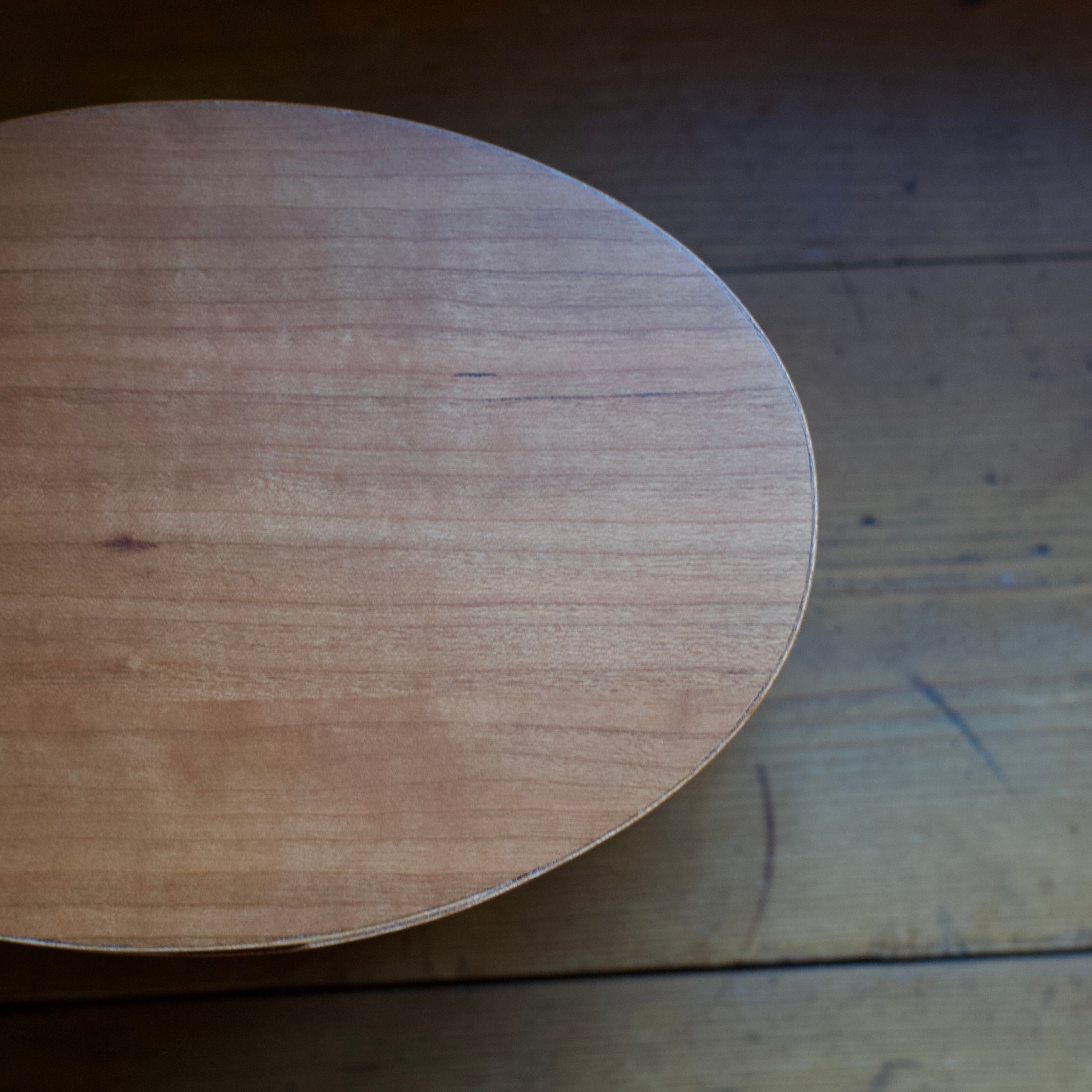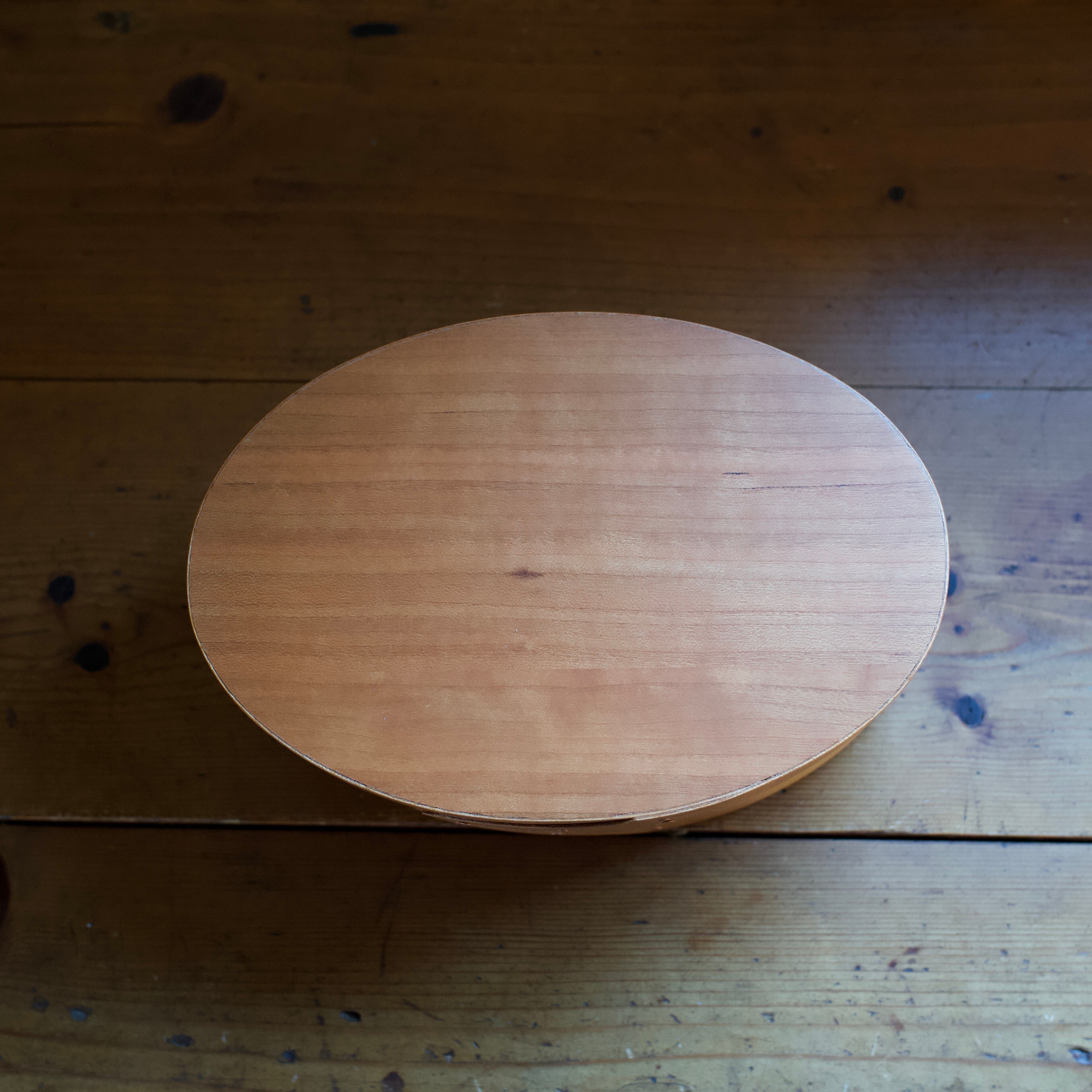 薄くスライスされた木材を曲げて作ったオーバル型のボックスです。