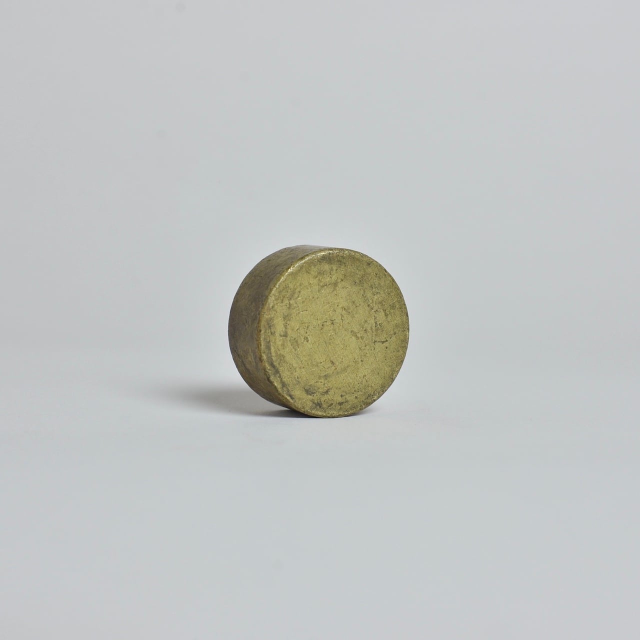 天秤などで使用していたであろう、つまみの付いた小さなおもしで、真鍮特有のくすみ方がかっこいい雰囲気です。