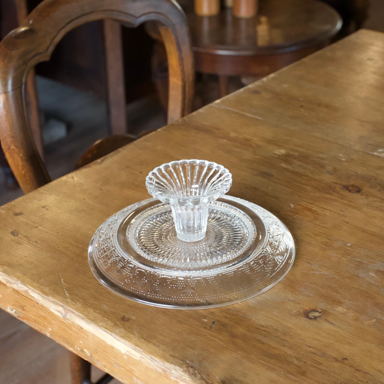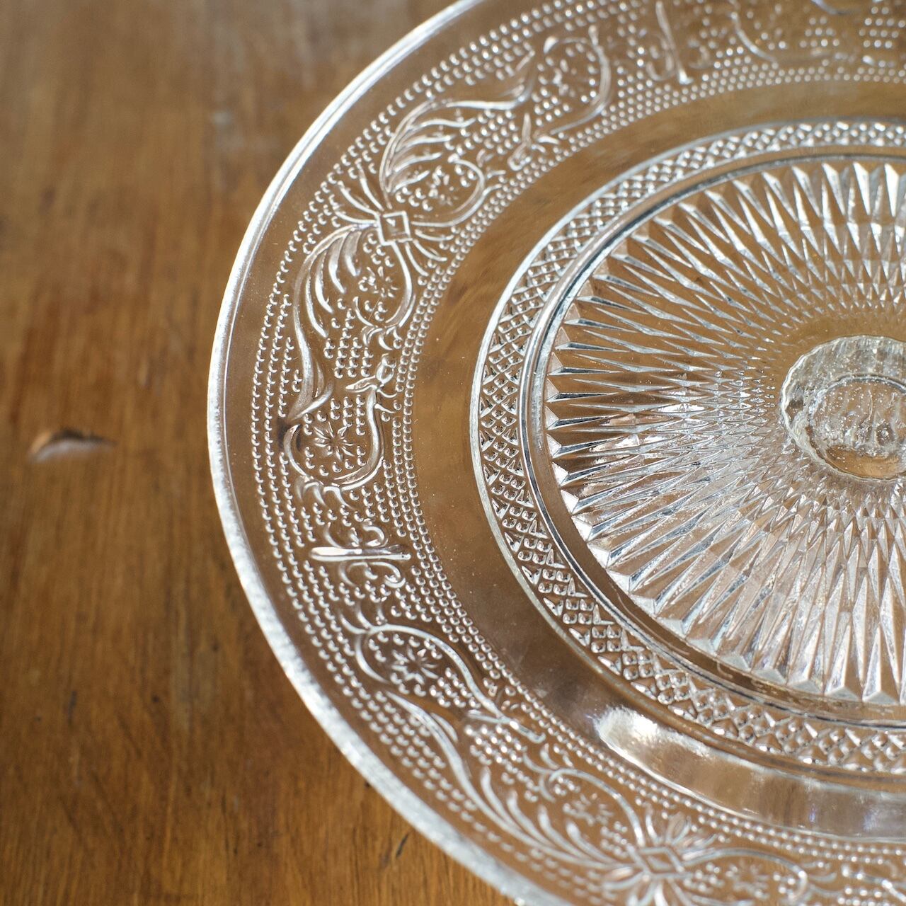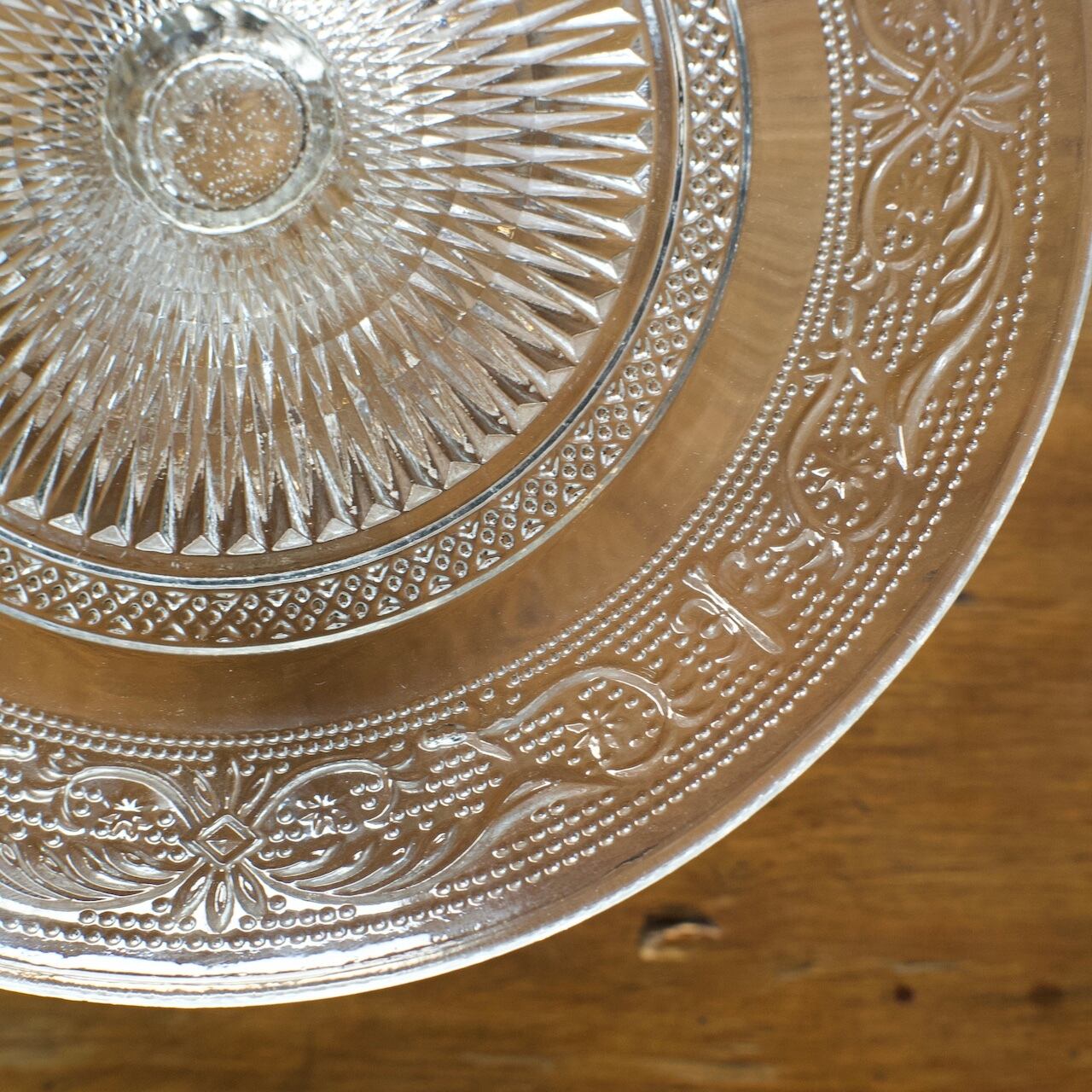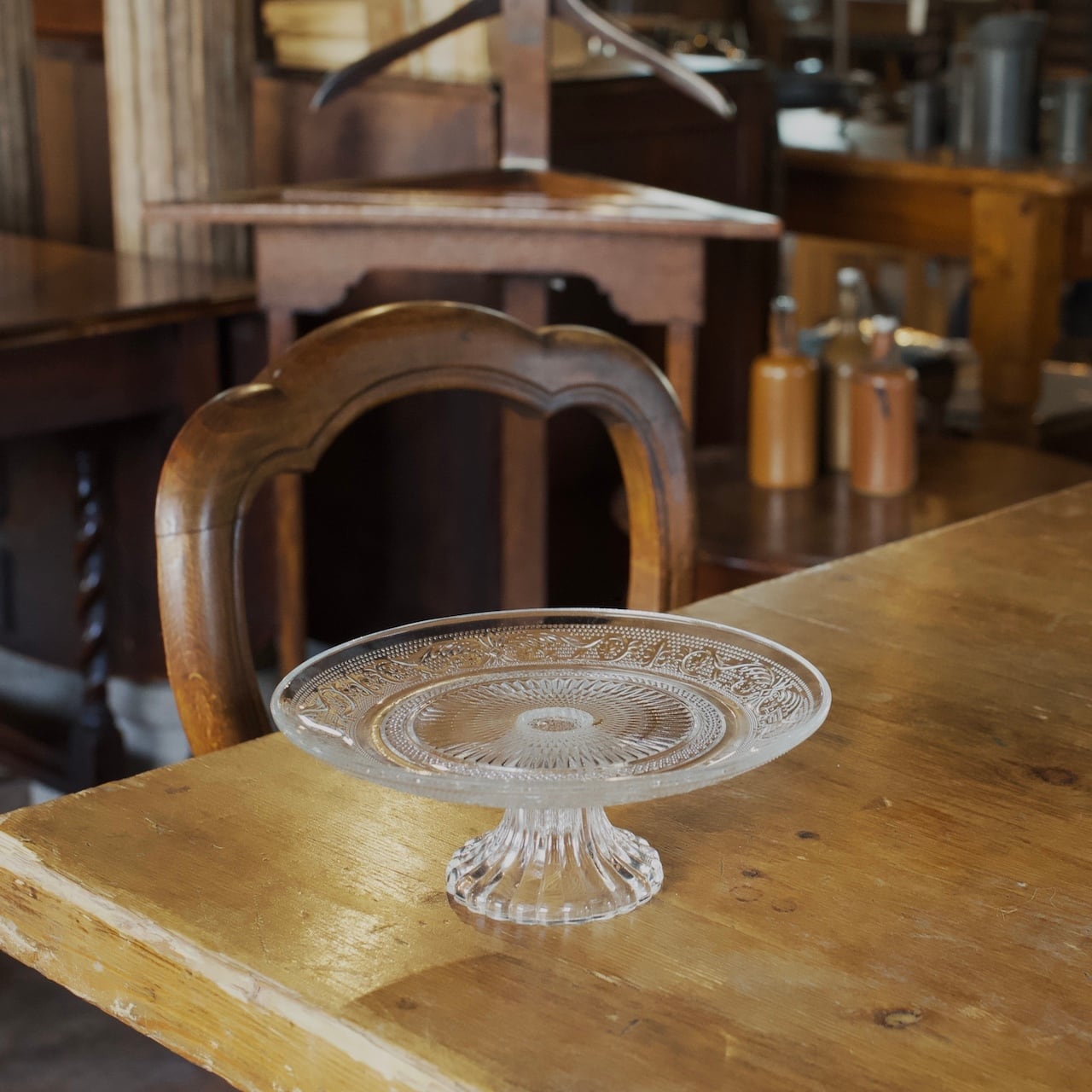 溶かしたガラスを型に流し込んで形成するプレスガラスで作られたケーキスタンドです。