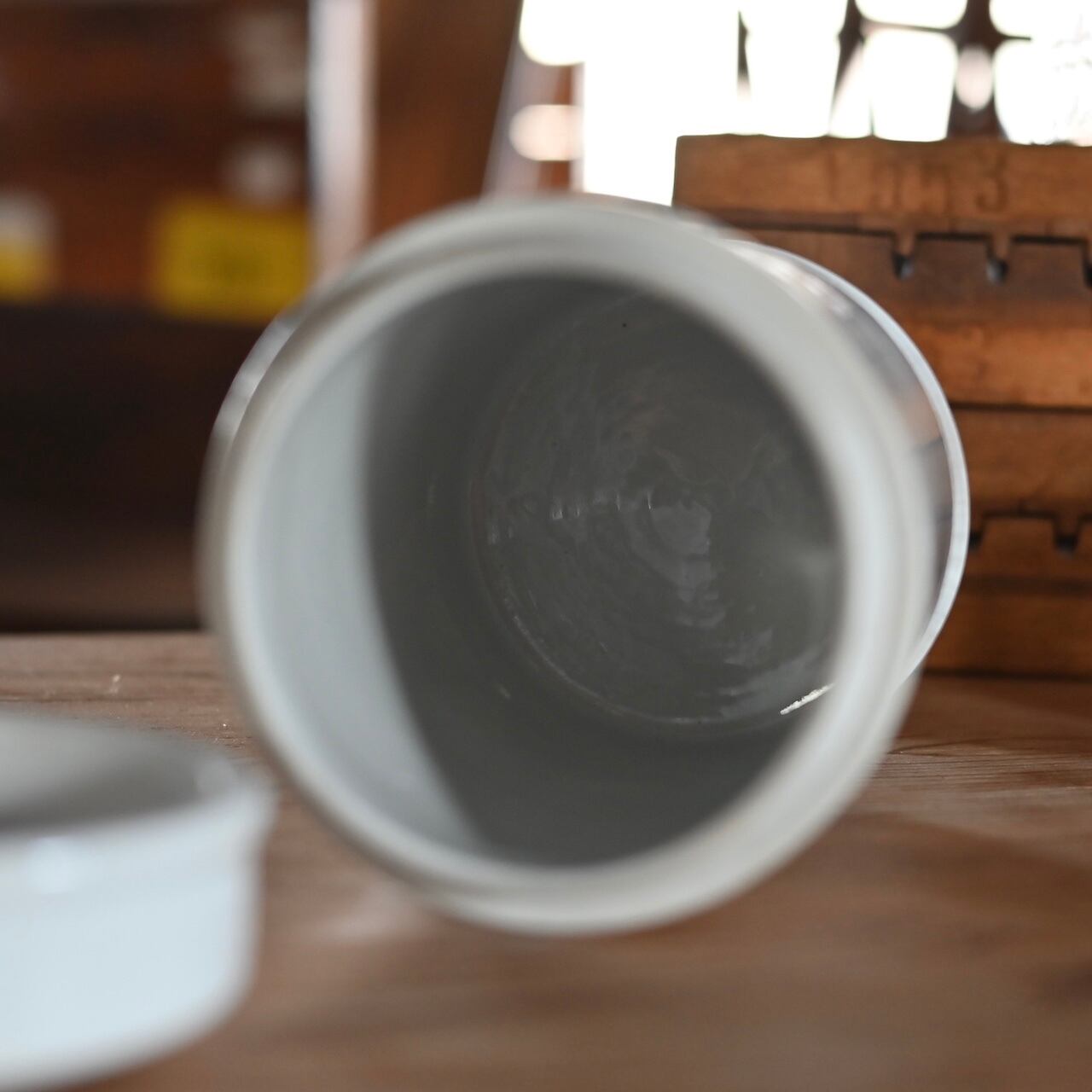美しい白い陶器で出来たこのキャニスターは、ずっしりと重く所々に傷や欠けなどがあり、長い年月の経過を感じさせます。