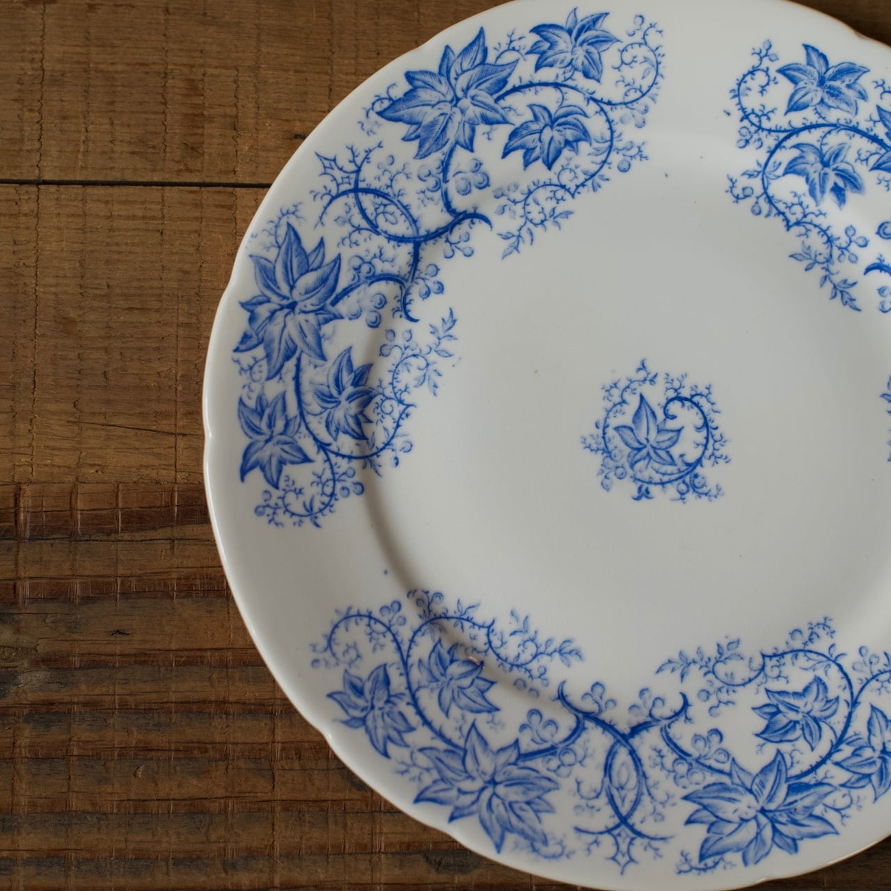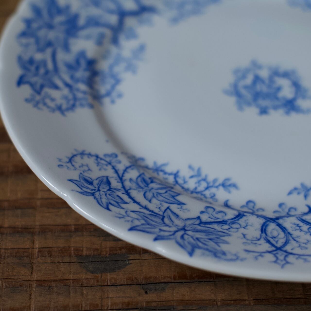 透き通るような白地の花リムのプレートにブルーで美しい植物が描かれています。