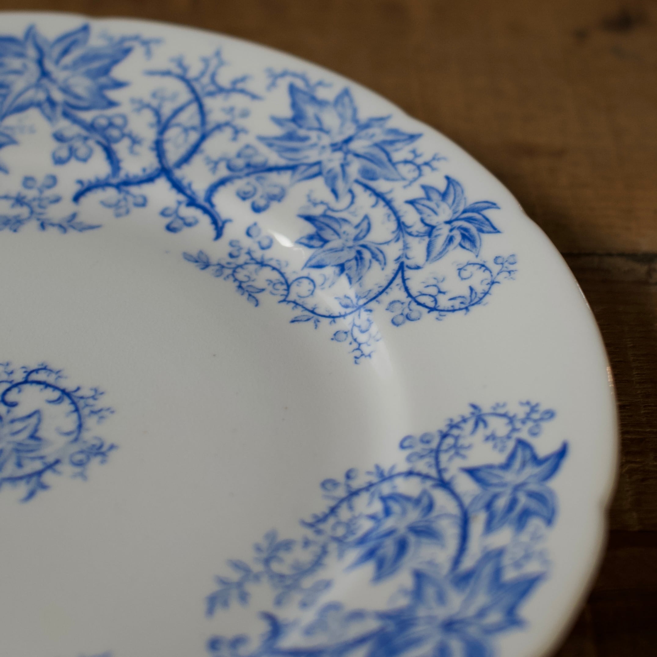 透き通るような白地の花リムのプレートにブルーで美しい植物が描かれています。