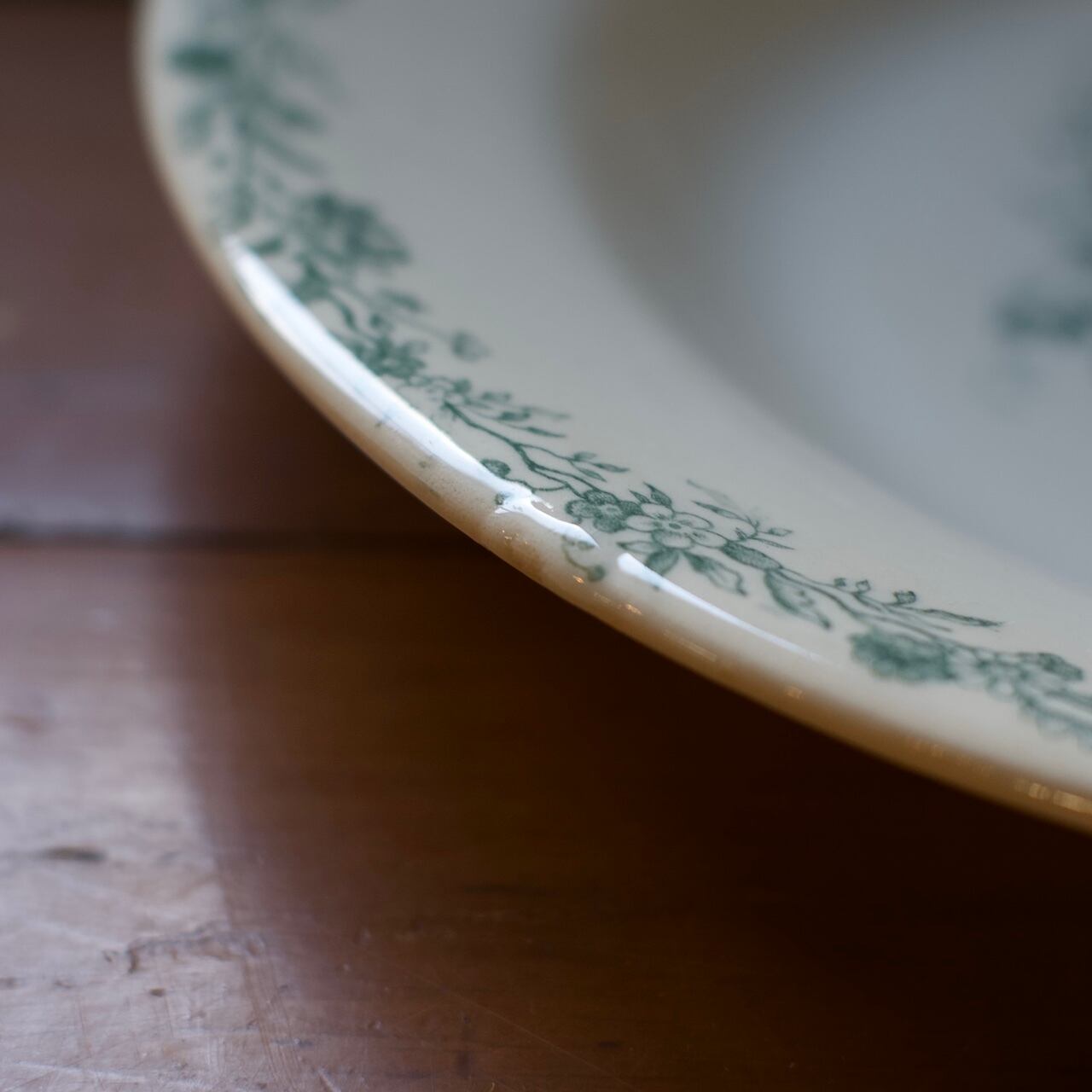 当店で取り扱いをしているフランスの食器は80年以上経過しているものが殆どです。古いものになりますので、貫入(釉薬の細かいひび割れ)やカトラリーによる傷、シミや汚れ、小さな欠けなどがあるものもございます。なるべく細かく写真を撮っておりますが、撮りきれない部分や水を含んで現れる貫入などもありますので、神経質な方や新品のようなクオリティーを求めるお客様には不向きな商品になっております。