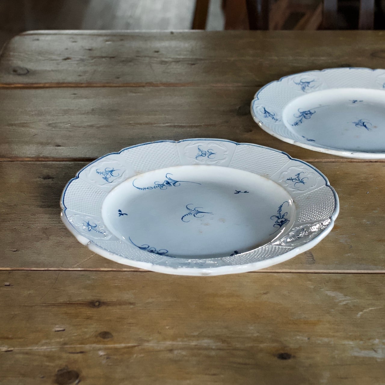 窯元は不明ですが、花リムの部分には凹凸で飾りが施され、ブルーで描かれた植物が素敵なデザインです。