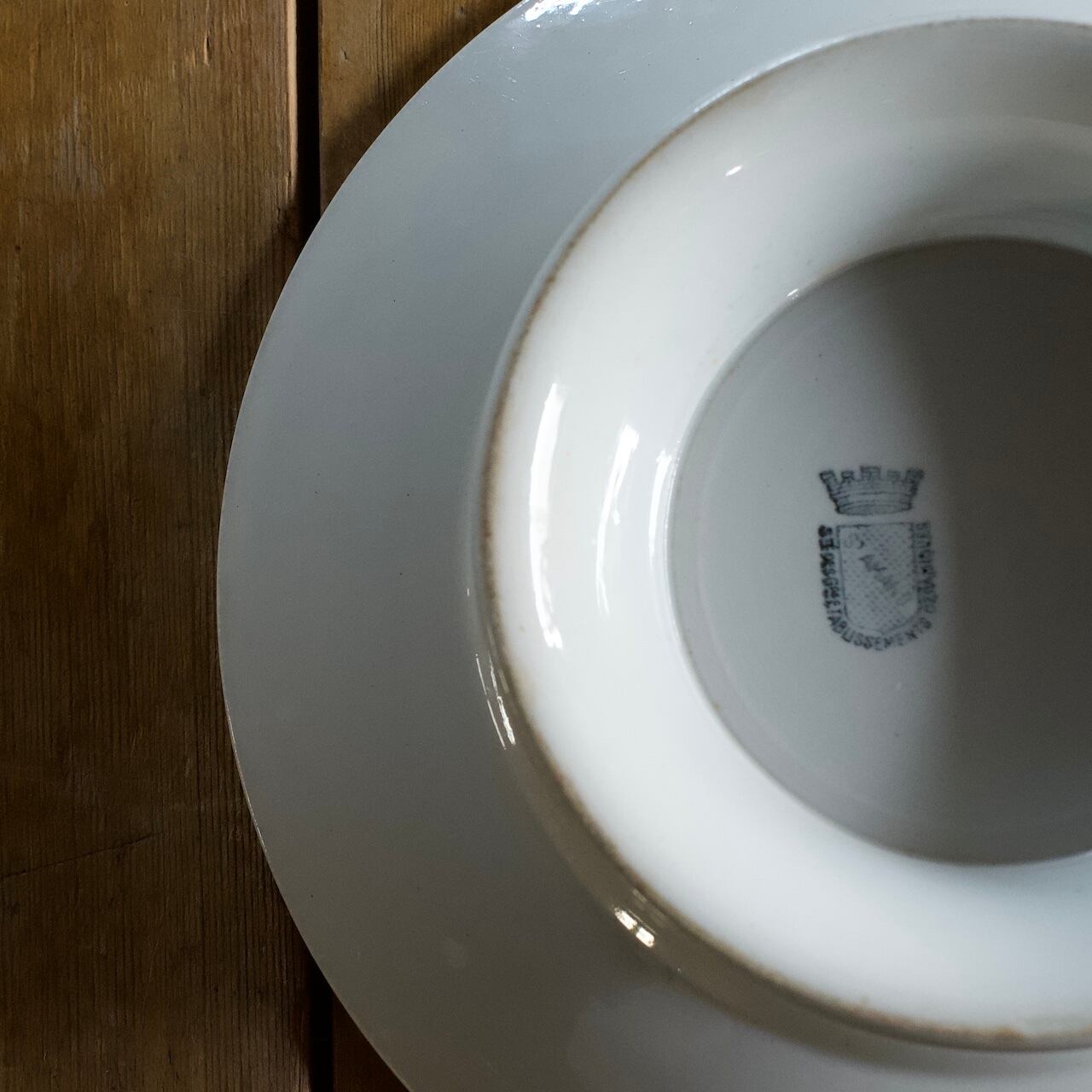当店で取り扱いをしているフランスの食器は80年以上経過しているものが殆どです。古いものになりますので、貫入(釉薬の細かいひび割れ)やカトラリーによる傷、シミや汚れ、小さな欠けなどがあるものもございます。なるべく細かく写真を撮っておりますが、撮りきれない部分や水を含んで現れる貫入などもありますので、神経質な方や新品のようなクオリティーを求めるお客様には不向きな商品になっております。