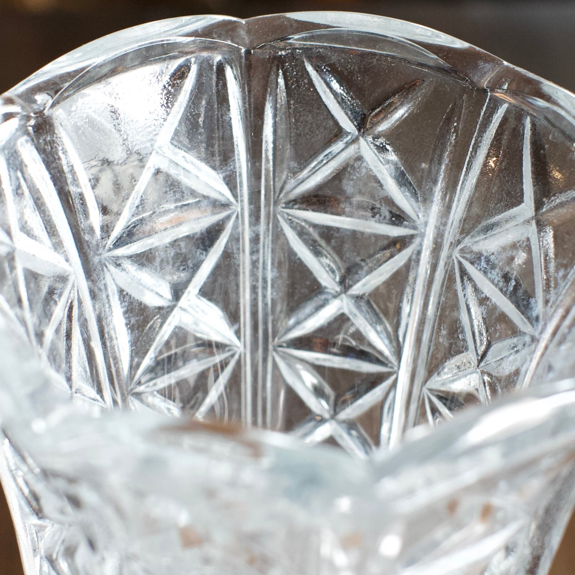 ガラスの模様がキラキラと美しい、くびれのあるフラワーベースです。