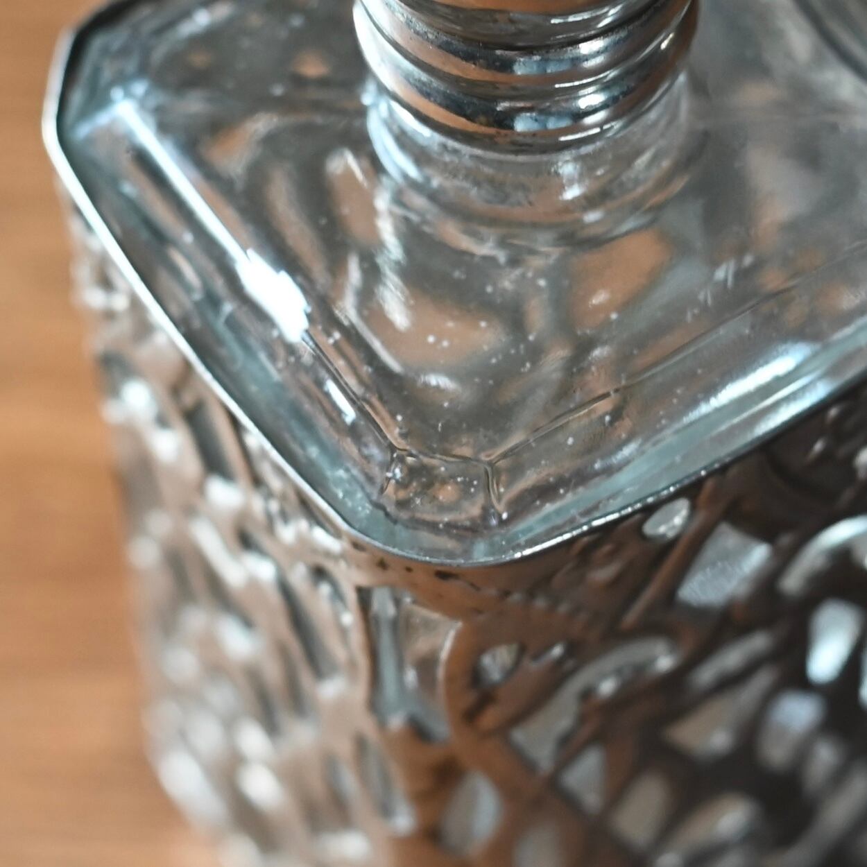 ガラスのボトルの周りに飾りがぐるっと巻かれていて、かっこいい雰囲気のボトルです。