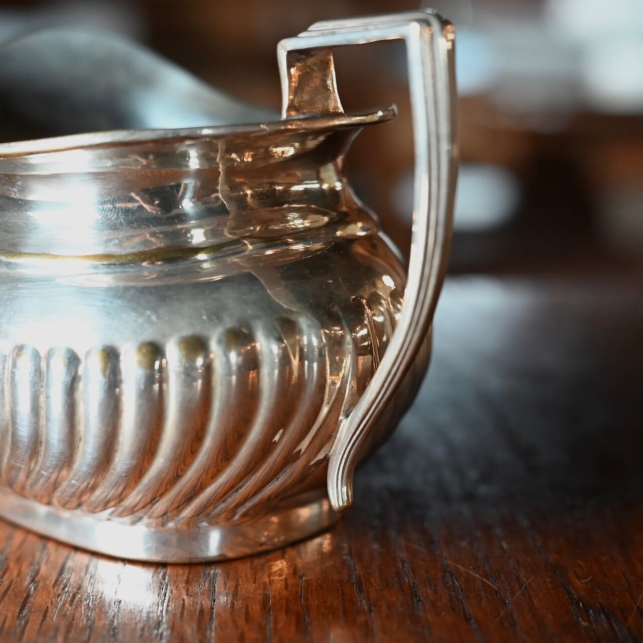注ぎ口が大きく、本体の縦のラインや持ち手などのデザインがエレガントな雰囲気のミルクポットです。