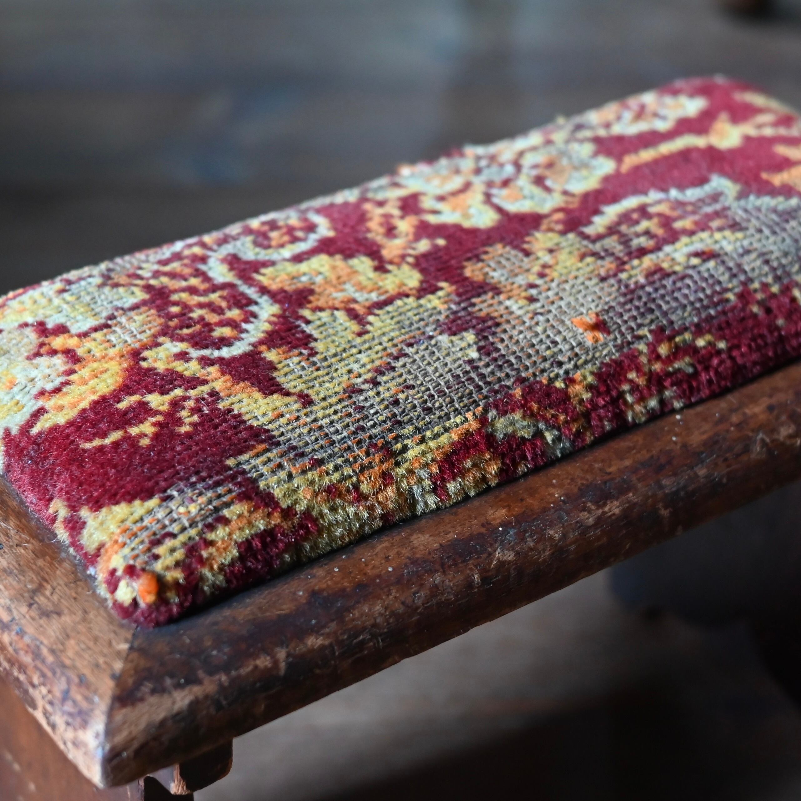 可愛らしい布張りの小さなスツールで、脚の歪みや布の擦り減りなどもありますがアンティークの魅力が詰まっています。