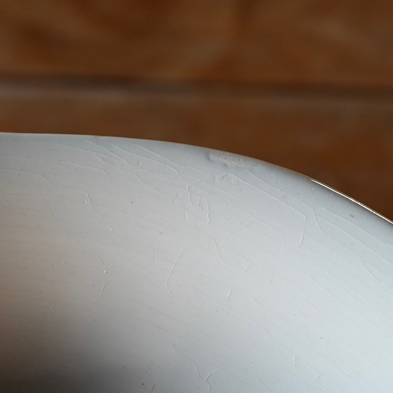 当店で取り扱いをしているフランスの食器は80年以上経過しているものが殆どです。古いものになりますので、貫入(釉薬の細かいひび割れ)やカトラリーによる傷、シミや汚れ、小さな欠けなどがあるものもございます。なるべく細かく写真を撮っておりますが、撮りきれない部分や水を含んで現れる貫入などもありますので、神経質な方や新品のようなクオリティーを求めるお客様には不向きな商品になっております。