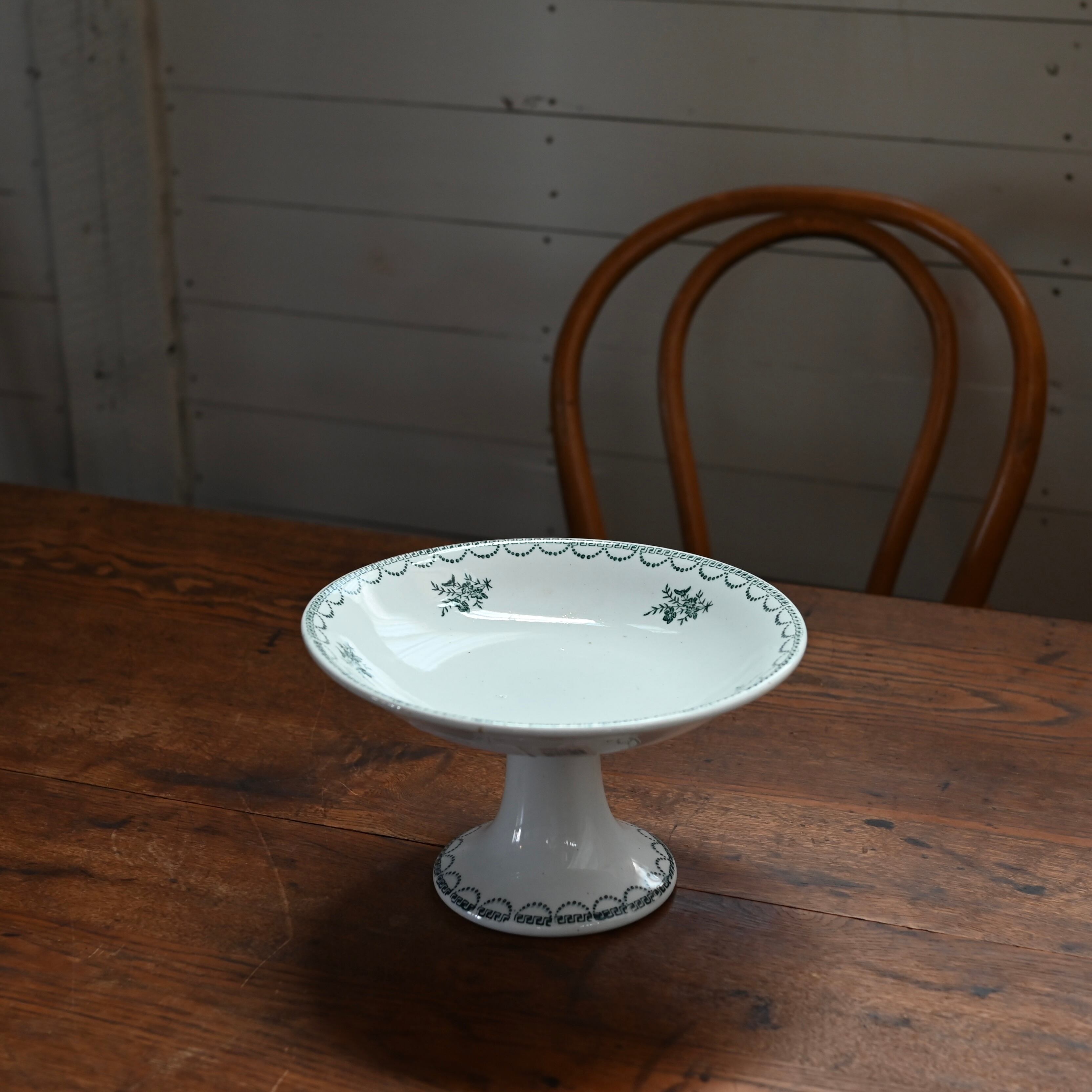 グリーンで描かれた植物とガーランドが素敵なコンポートで、プレート部分は綺麗な丸型ではなく少し歪みがあるのもアンティークの魅力のひとつです。