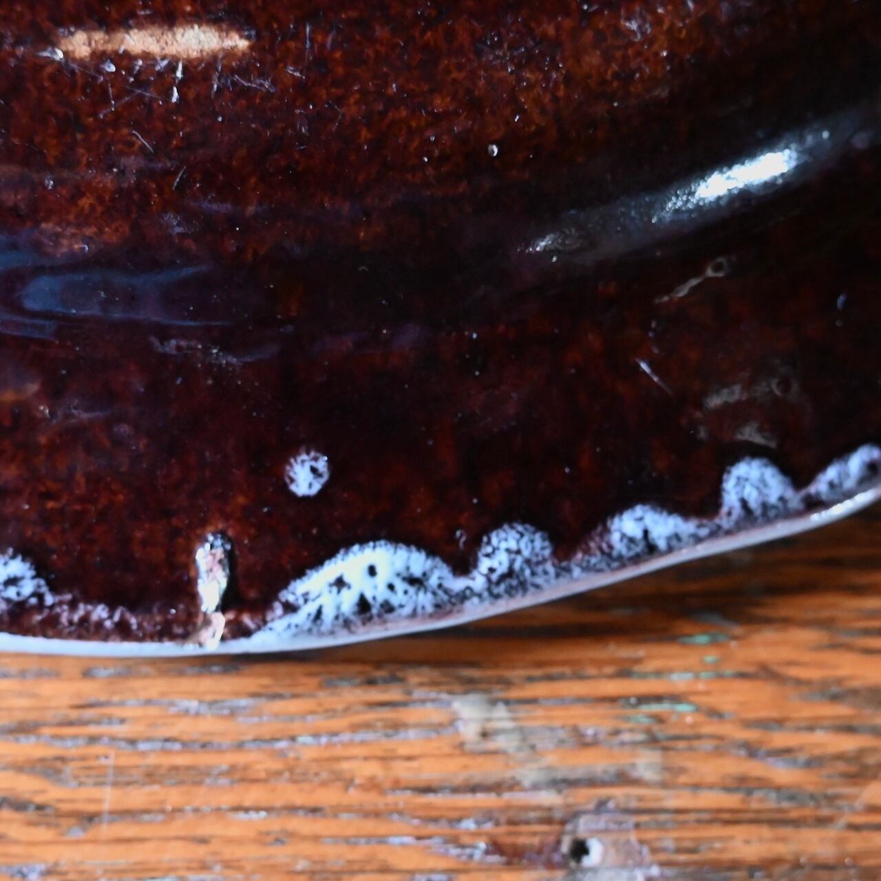 キュノアールは18世紀〜19世紀頃のフランス北部を中心に作られていた雑器で、赤褐色の陶土に表面は白や灰色の釉薬、背面には焦げ茶の釉薬で仕上げたものです。